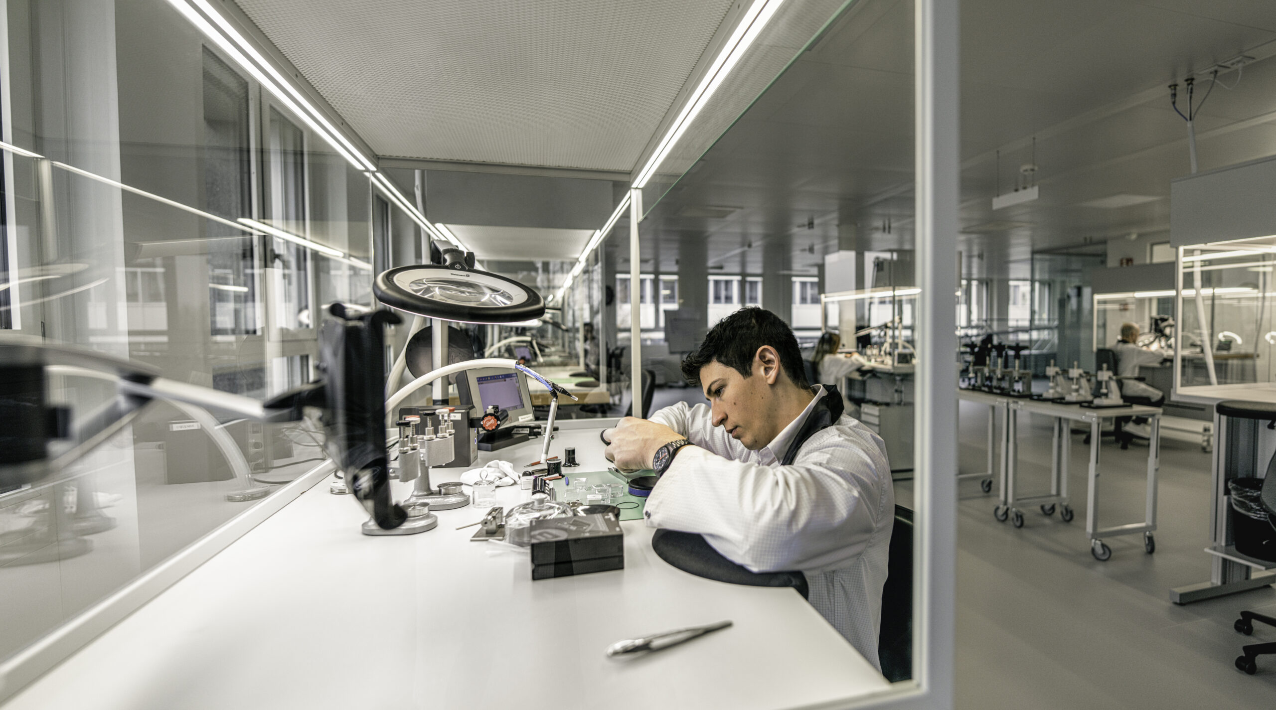 Das historische Gebäude wurde umfassend modernisiert und funktional neu strukturiert. Auf einer Gesamtfläche von rund 3.600 Quadratmetern stehen derzeit zehn hochmoderne Uhrmacherplätze zur Verfügung. Die klare, symmetrische Architektur und eine helle, offene Innenraumgestaltung schaffen ein Arbeitsumfeld, das konsequent auf die Anforderungen feinmechanischer Fertigung abgestimmt ist.