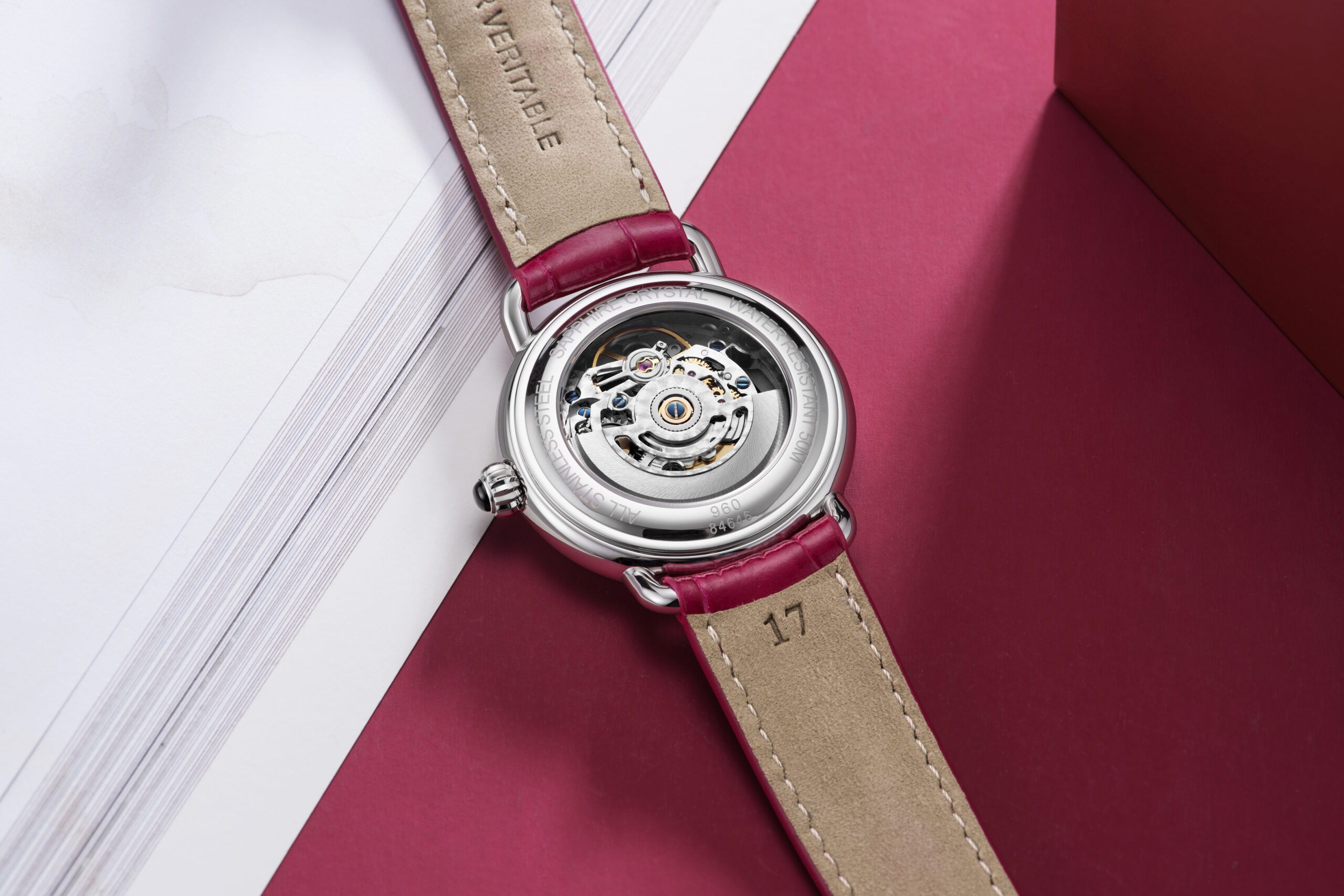 Mit einem Gehäusedurchmesser von 35 mm passt die anmutige Uhr an jedes Handgelenk und bietet Raum genug, um dem Spiel des mit Sorgfalt skelettierten Uhrwerks zu folgen. Der Einblick in das mechanische Herz ist faszinierend und bringt den komplexen Mechanismus des Uhrwerks, einem Schauspiel gleich, zur Geltung. Passend zur Erscheinung wurden die Zeiger in Blau gewählt. So heben sie sich farblich vom skelettierten Uhrwerk ab. Bei jeder Ausführung ist der mit einem Strichdekor versehene Anzeige-Ring bei 3, 6 und 9 Uhr mit Diamanten besetzt.