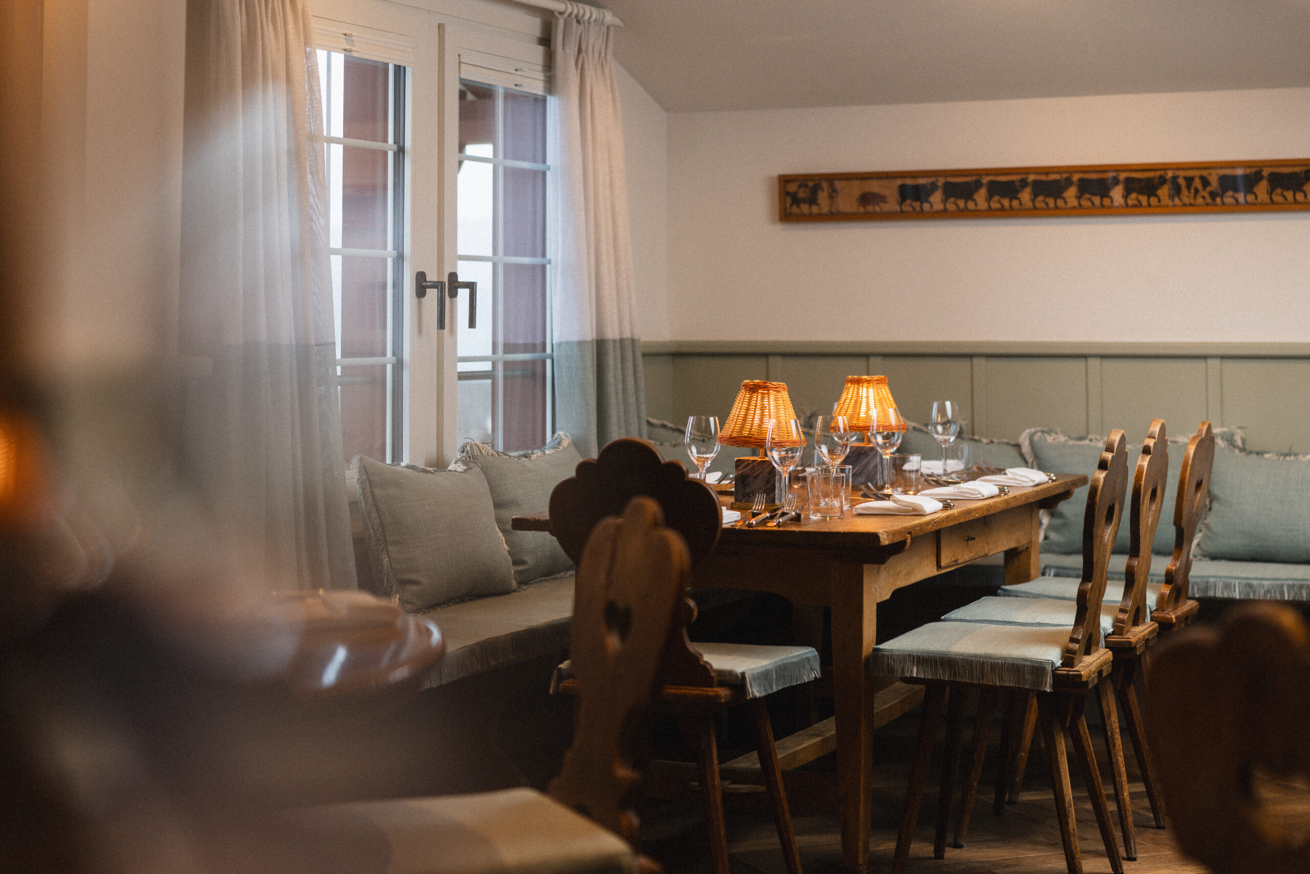 Design mit lokalem Bezug und internationalem Charme Für die sanften Renovationsarbeiten setzte Caminada auf das Interior-Design-Team des Atelier Zürich. «Diesen schwer in Worte zu fassenden Puls der Stadt wollten wir auch in der Buech spürbar machen und ein lokales Team war dafür die perfekte Wahl», erklärt Caminada. Die seit Generationen auf Hochglanz polierten Tische sowie die geschnitzten Stühle bleiben weiterhin zentrale Elemente der Inneneinrichtung. «In jedem Bereich soll eine Verbindung zur umliegenden Natur und zur aussergewöhnlichen Kunst spürbar sein», so Caminada weiter. Die Holzstühle und Bänke erhielten mit farblich auf die einzelnen Räume abgestimmten Sitzpolstern eine dezente Auffrischung. Ergänzende gestalterische Details zollen der Verbindung des Hauses mit den Traditionen des Kantons Appenzell stilvoll Tribut.