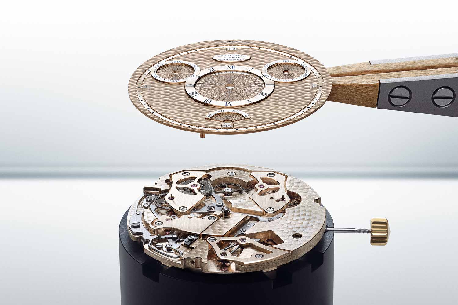 Obwohl das Uhrwerk nicht neu ist, fühlt sich die Ref. 7225 dank eines durchdachten Redesigns, das ihr eine größere optische Ausgewogenheit verleiht, völlig frisch an – und weitaus attraktiver als die ursprüngliche 7727 aus dem Jahr 2012. Das Zifferblatt verfügt über ein prächtiges Layout mit drei Zählern: Stunden und Minuten in der Mitte, zwei laufende Sekunden oben links und rechts sowie eine Gangreserveanzeige bei sechs Uhr.