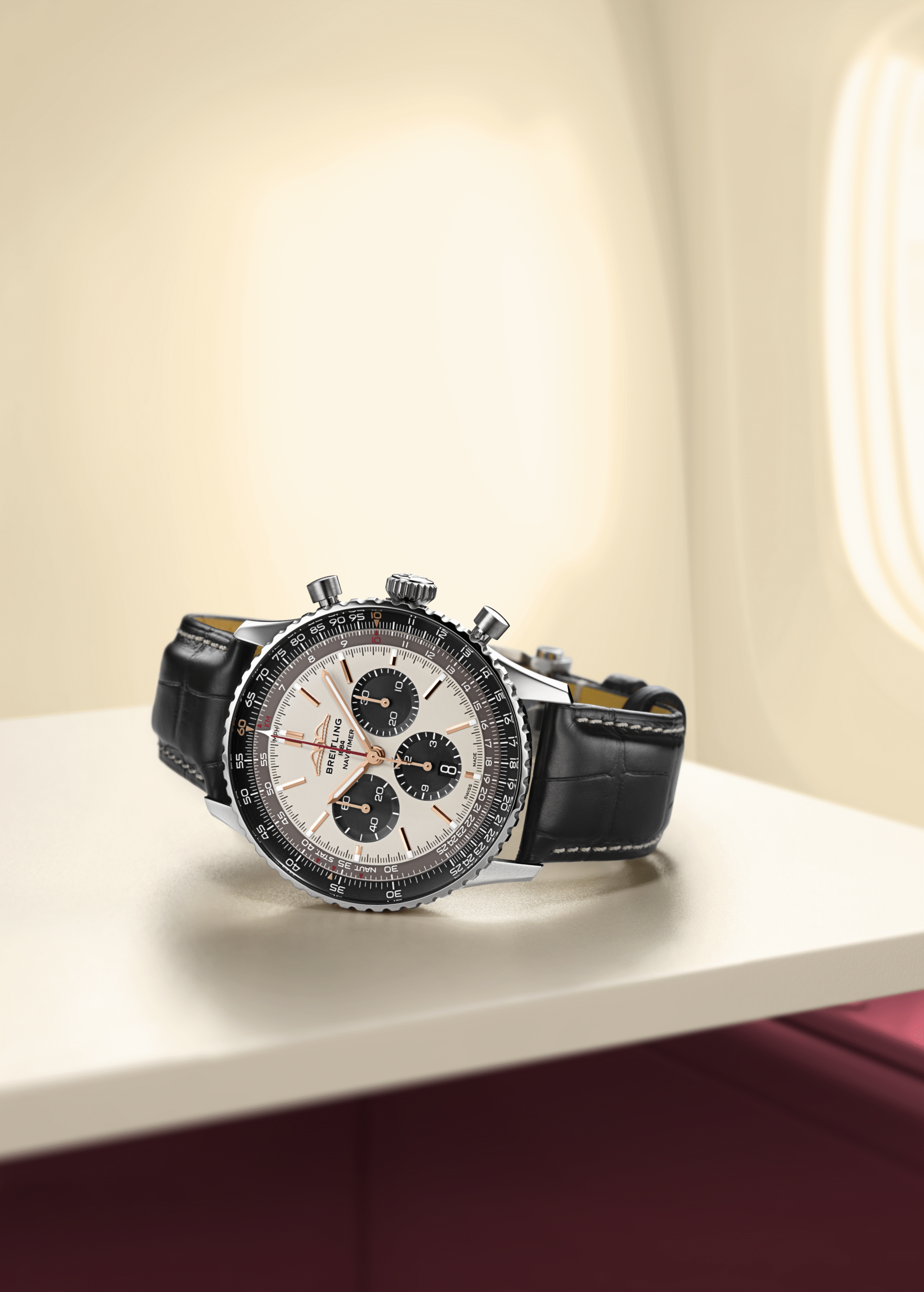 Zu den Details dieser Ikone von Breitling gehört eine geriffelte Lünette, die eine optimale Handhabung, selbst mit Handschuhen, ermöglicht, während das AOPA-Flügel-Logo auf 12 Uhr das fliegerische Erbe der Kollektion würdigt. Den zentralen Chronographenzeiger ziert ein Flugzeug, das über das Zifferblatt zu fliegen scheint. Auf 6 Uhr unterstreicht das Datumsfenster die Symmetrie des Designs, während der berühmte kreisförmige Rechenschieber – das zeitlose Markenzeichen der Navitimer seit über 70 Jahren– dieses ikonische Modell der Uhrmacherkunst vervollständigt.
