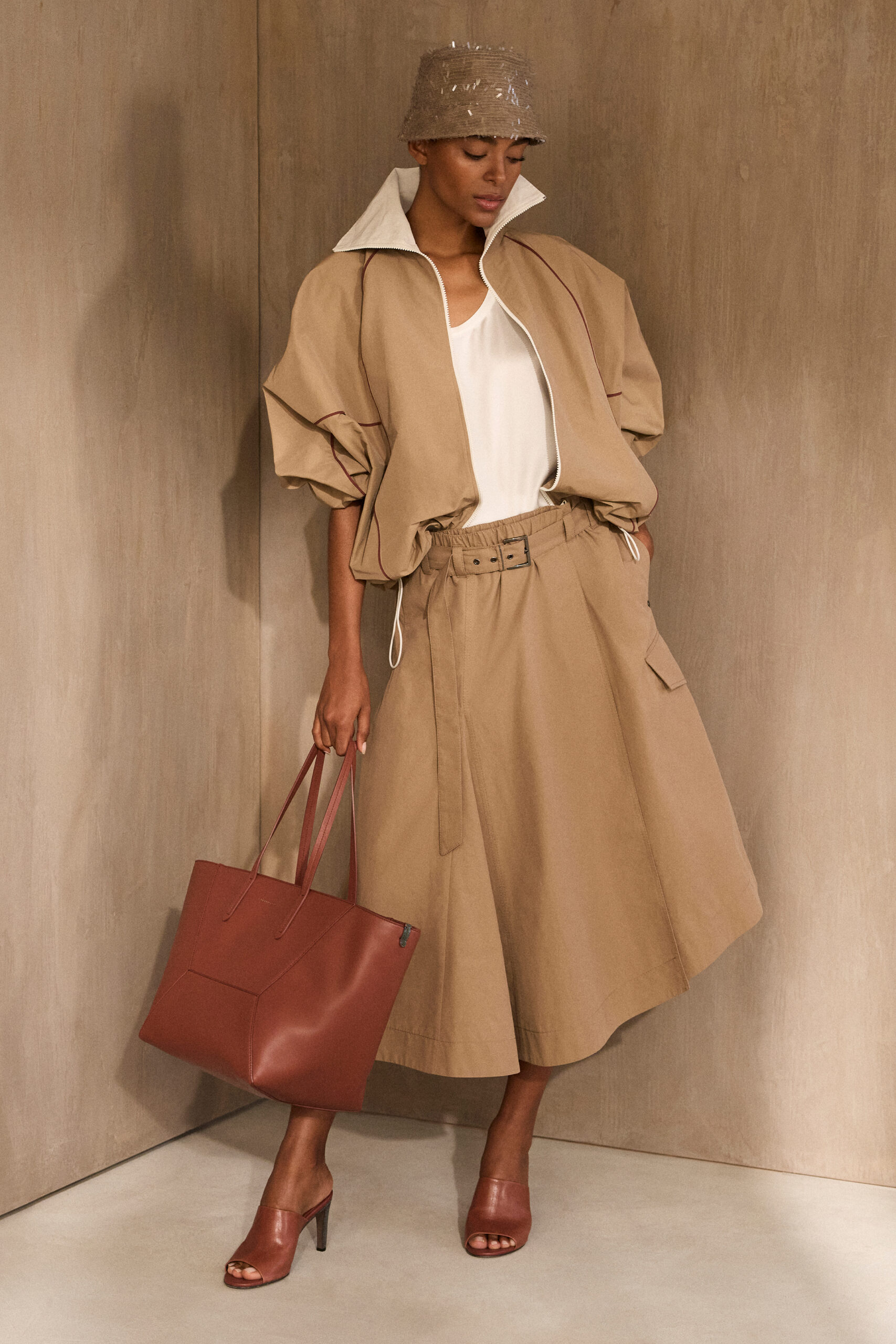 Die Farbpalette bleibt zurückhaltend und souverän: Sanfte Naturtöne von hellem Sand bis zu warmem Braun betonen die Klarheit der Linienführung und verleihen der Kollektion ihre zeitlose Ausstrahlung. Jedes Detail folgt der unverkennbaren Handschrift des Hauses – einer Handwerkskunst, die man spürt, ohne sie erklären zu müssen.