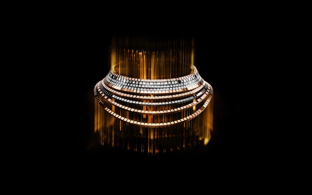 Highlight der Kollektion ist ein einzigartiges, wandlungsfähiges Collier, das aus beweglichen Reihen von Würfeln besteht, die Ethisches Rosé- und Weissgold kombinieren. Insgesamt neun Reihen bilden eine dynamische Silhouette, die dem Anlass angepasst werden kann: Jeweils drei Reihen des Colliers können abgenommen werden, um eine schmälere Version des Schmuckstücks zu tragen. Dieses modulare Design erinnert an die Möglichkeit, mehrere Ice Cube Ringe und Armreifen im Stil des Stacking-Trends miteinander zu kombinieren. Allerdings führt das Collier dies noch weiter und besticht durch Geschmeidigkeit, Anordnung und eine imposante Präsenz. Würfel in zwei verschiedenen Grössen und Höhen verleihen dem Collier zusätzliche Dimensionen. Sie sind entweder spiegelpoliert oder mit Brillanten besetzt, was einem wechselnden Rhythmus folgt und das Gefühl von Bewegung unterstreicht.
