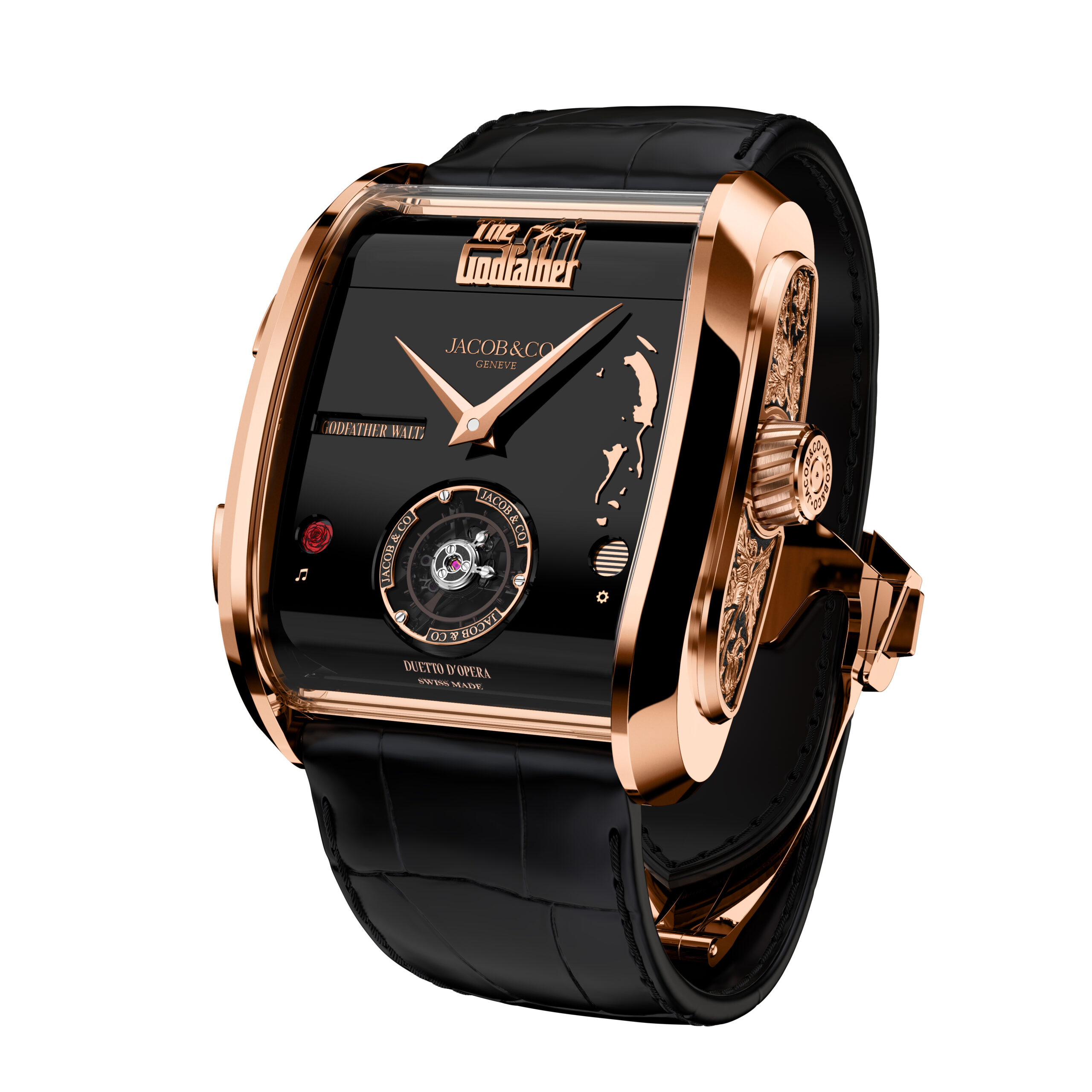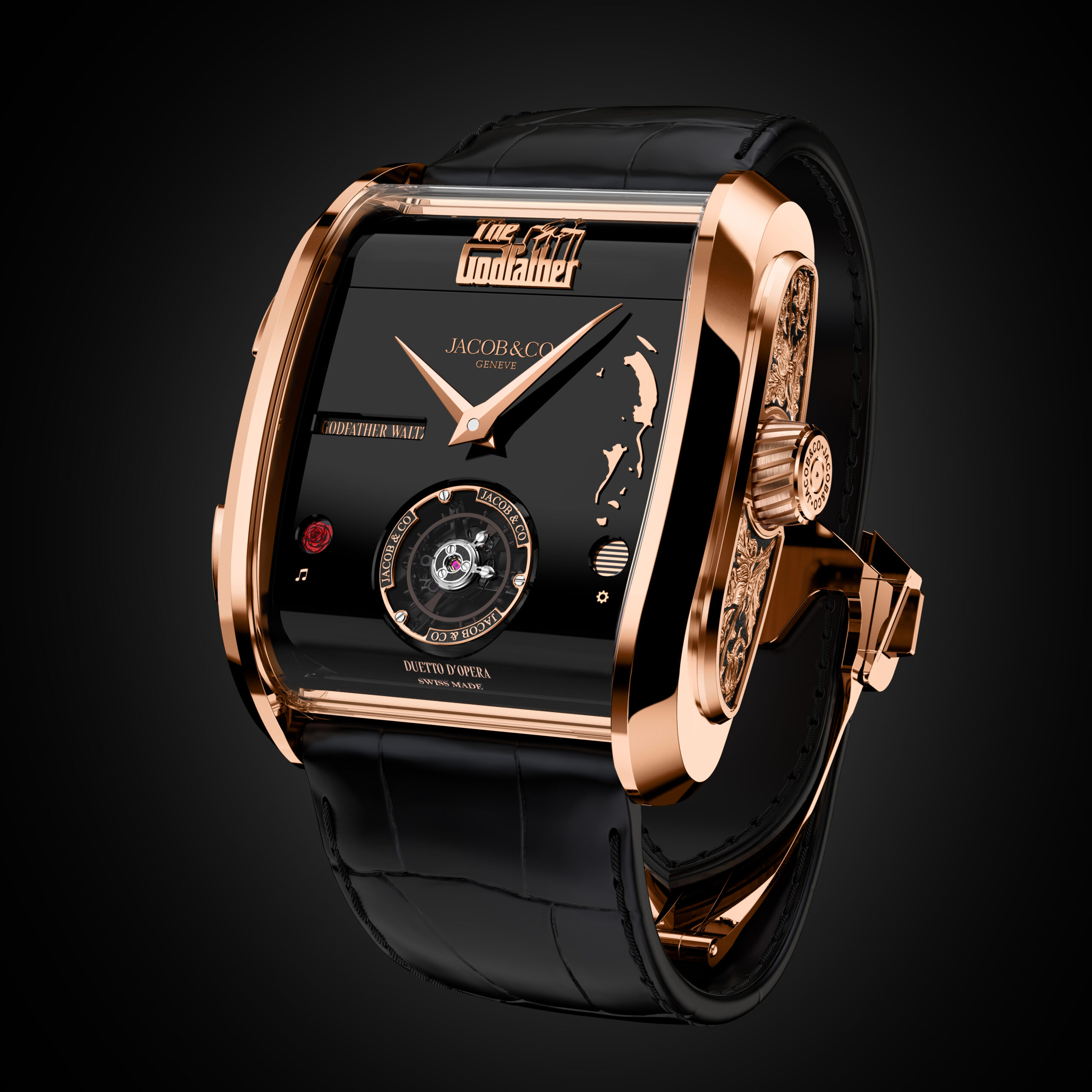 Ein fein detailliertes Porträt von Marlon Brando als Don Corleone verankert das Zifferblatt, zusammen mit den charakteristischen Puppenfäden der Franchise, die in dreidimensionaler Applikation gestaltet sind.Das 42 x 44 mm große Roségoldgehäuse markiert eine Abkehr vom Opera Godfather, mit seinem gebogen, ergonomischen Profil und Art-Déco-Design. Das Gehäuse zeigt eine klavierförmige saphirförmige Öffnung, die den inneren Spieluhrkamm freigibt. Es ist von einer Platte bedeckt, die mit der eigentlichen Partitur von The Godfather Love Theme graviert ist.