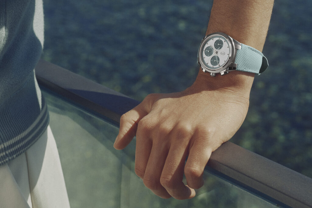 Die skelettierten, deltaförmigen Stunden- und Minutenzeiger unterstreichen die klare Ästhetik der Kollektion, während die Zeiger für Chronograph und kleine Sekunde einen dezenten technischen Akzent setzen.