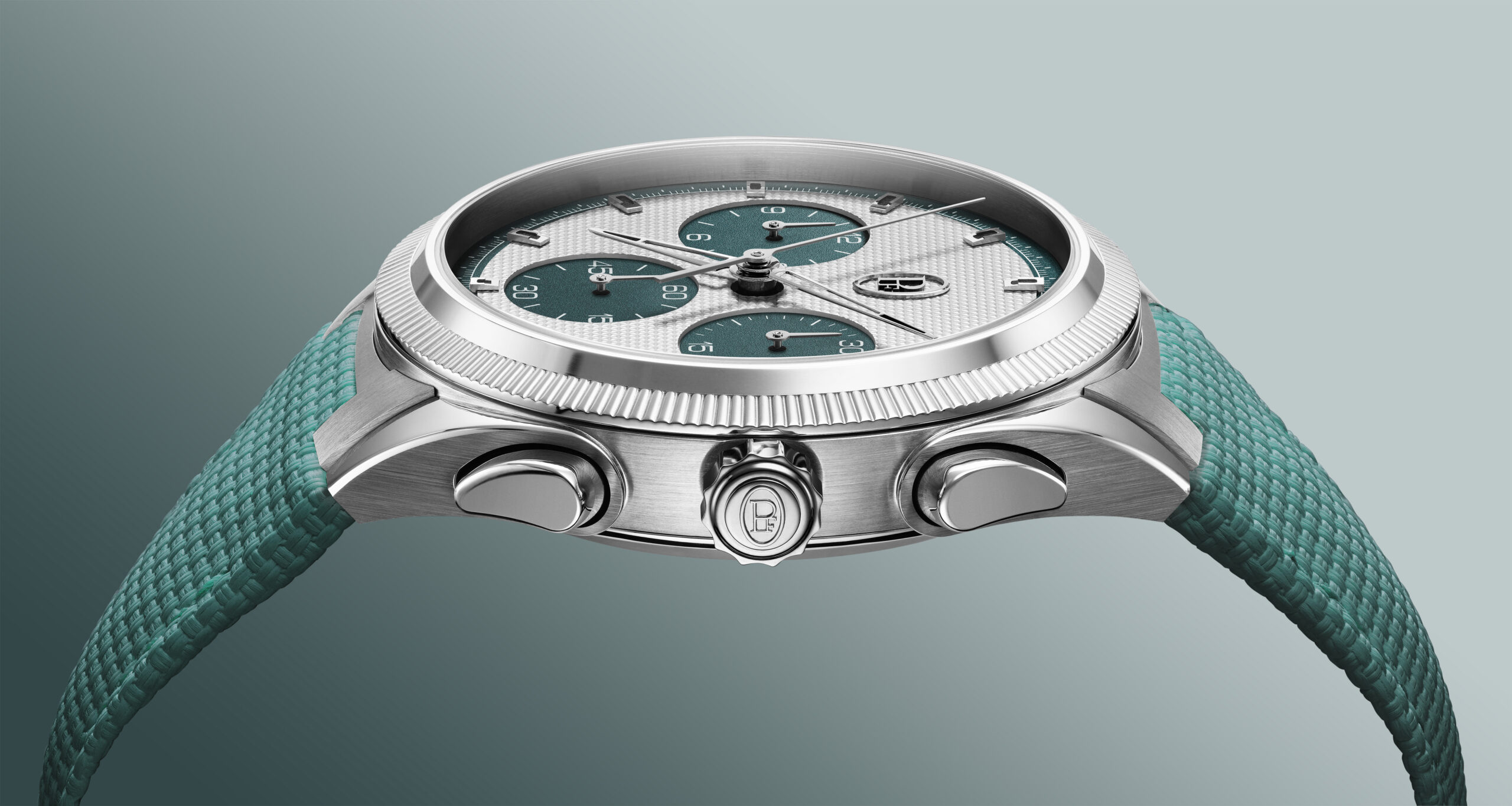 Die Chronographendrücker sind nahtlos in das Mittelteil des Gehäuses integriert, während die verschraubte Krone eine Wasserdichtheit bis 100 Meter gewährleistet.