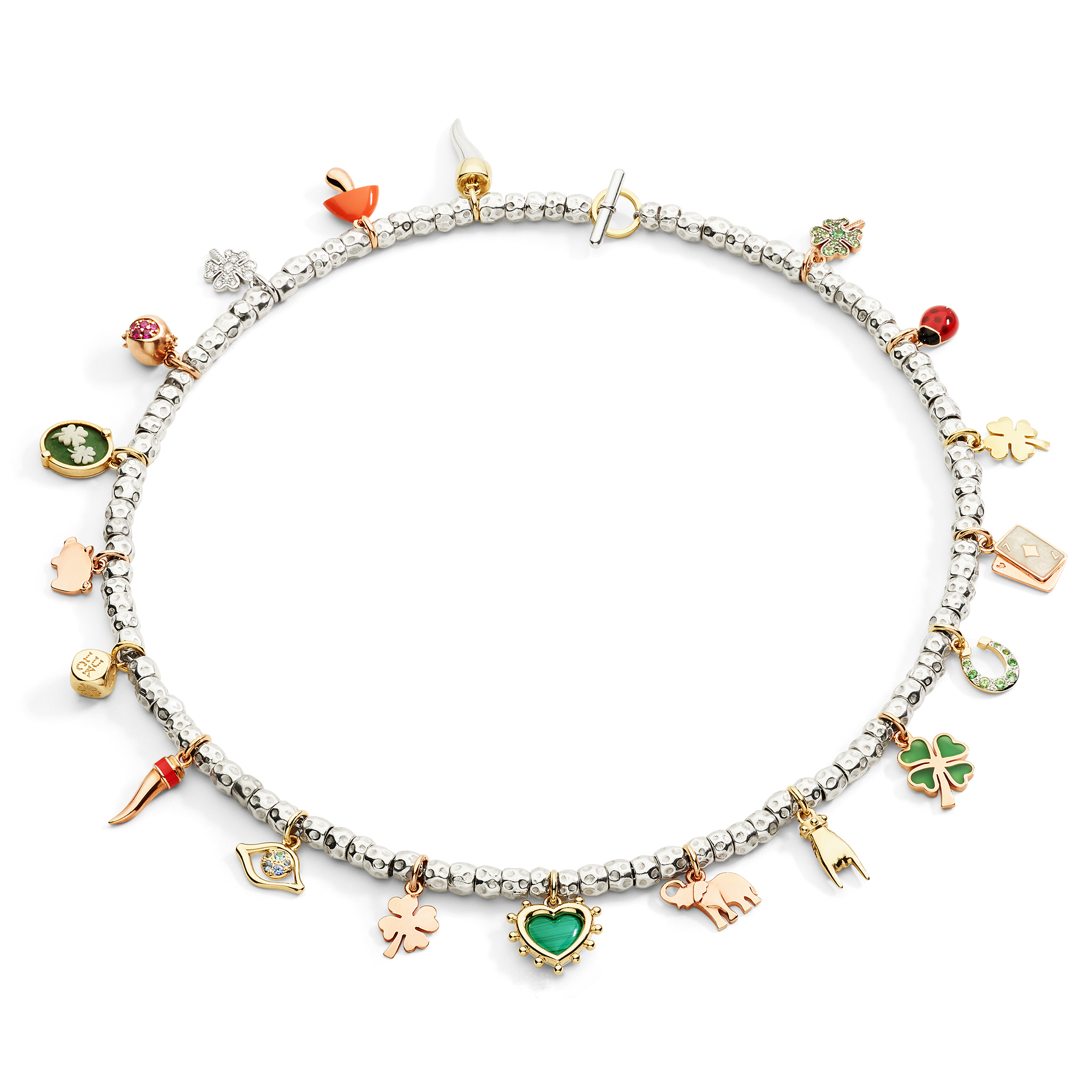 Weitere Symbole greifen klassische Glücks- und Schutzmotive auf: Eine Hand aus 9-karätigem Gold steht für Fürsorge und Orientierung, während ein Würfel aus Gelbgold mit Tsavoriten den Zufall und die Unvorhersehbarkeit des Lebens feiert. Ein kleines Schweinchen aus Roségold symbolisiert Wohlstand und Lebensfreude, während ein Pilz mit HyCeram-Emaille an nordische Glücksbringer erinnert.