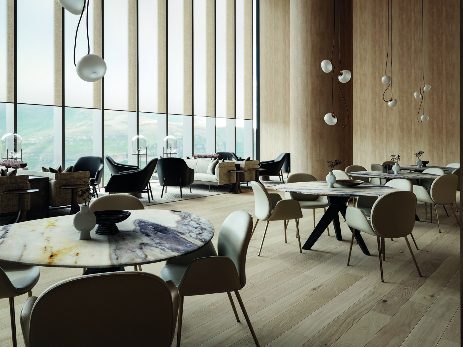 Viel helles Holz, die fein gemaserten und weich geschliffenen Natursteintische TRILOPE und das zeitlos schlichte Stuhlmodell COBE mit hellem Lederbezug. An diesem Objektbeispiel zeigt sich, dass DRAENERT die Farben- und Formensprache der Entschleunigung beherrscht.