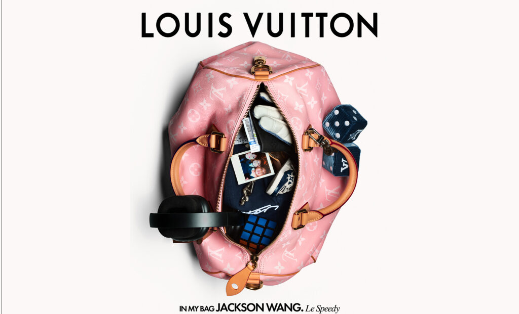 Hausbotschafter Jackson Wang setzt mit seiner pinkfarbenen Speedy P9 ein besonders eigenständiges Statement. An der Tasche befestigt ist ein Paar flauschiger Würfel, im Inneren finden sich professionelle Kopfhörer, ein Polaroid-Foto seiner Familie, ein Fechthandschuh, Musiknotationen, ein Zauberwürfel, ein Mini-Sneaker und weitere persönliche Objekte. Diese Auswahl wirkt vielschichtig und emotional: familiär, kreativ, spielerisch und diszipliniert zugleich. Gerade dadurch entsteht ein besonders intimes Bild seines Kosmos.