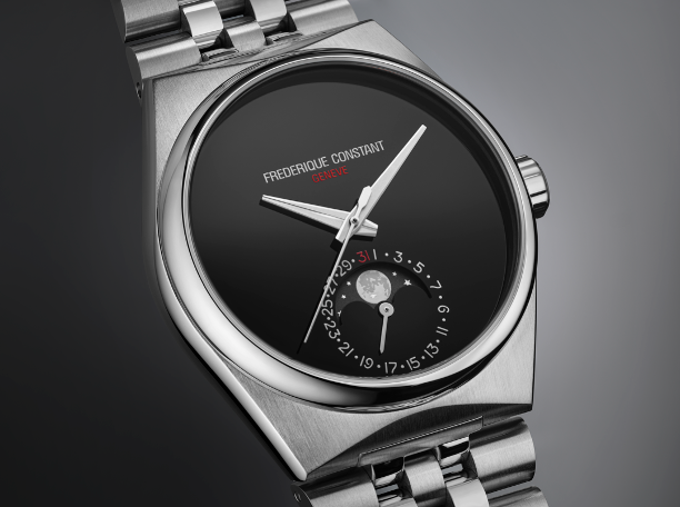 Dieses neue, aufsehenerregende Modell ist das erste der Highlife-Kollektion mit einer Mondphasenanzeige der Manufaktur Frederique Constant, und das erste mit einem integrierten Fünfgliederarmband und die erste Uhr, die Frederique Constant jemals ohne Indizes entworfen hat.