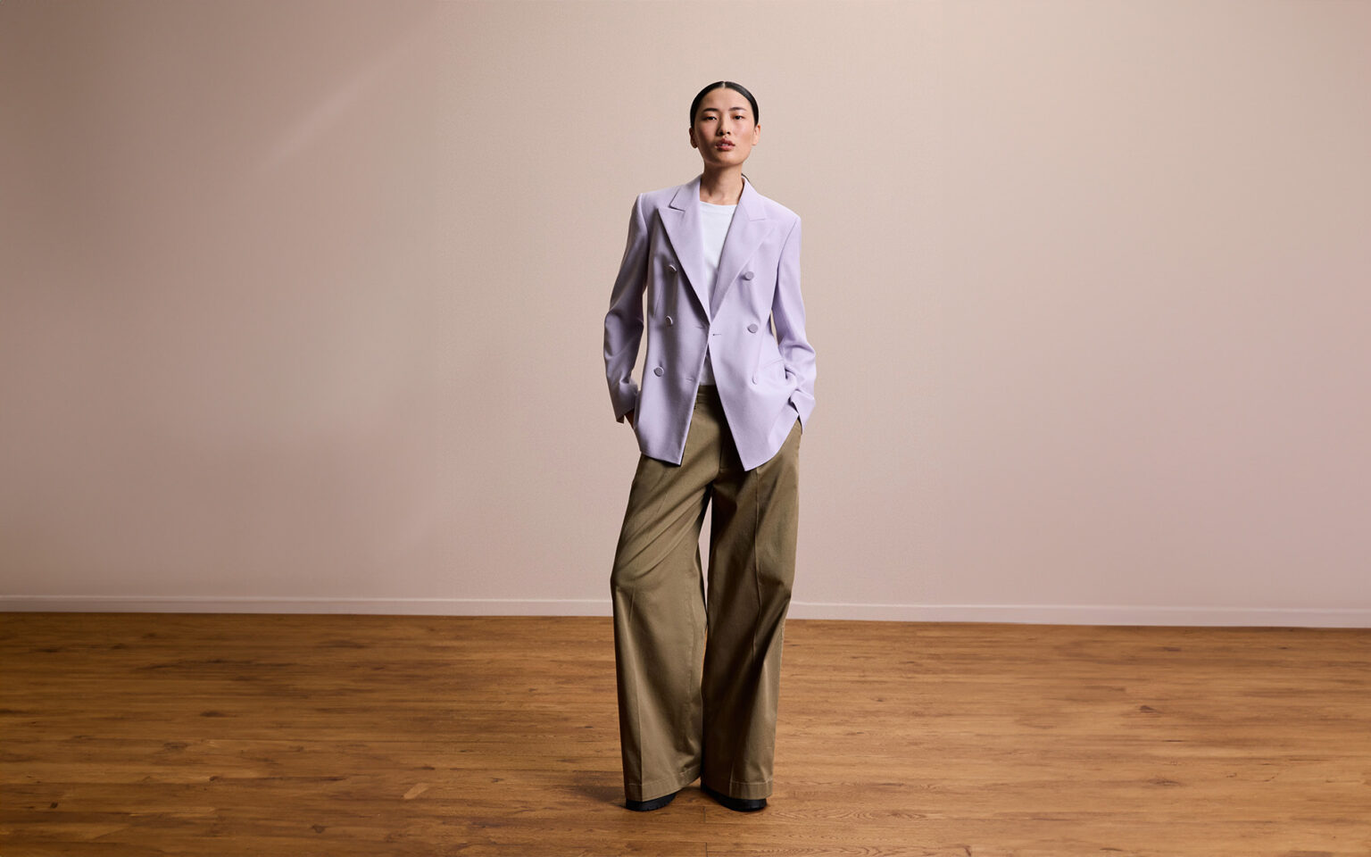 Ein Hosenanzug in harmonischen Pastelltönen, wie dem Blauton Sky verleiht Business-Tailoring eine moderne Frische. Für den Abend wird die Stoffhose mühelos gegen Denim getauscht – der Blazer bleibt und gibt dem Look einen urbanen, souveränen Charakter.