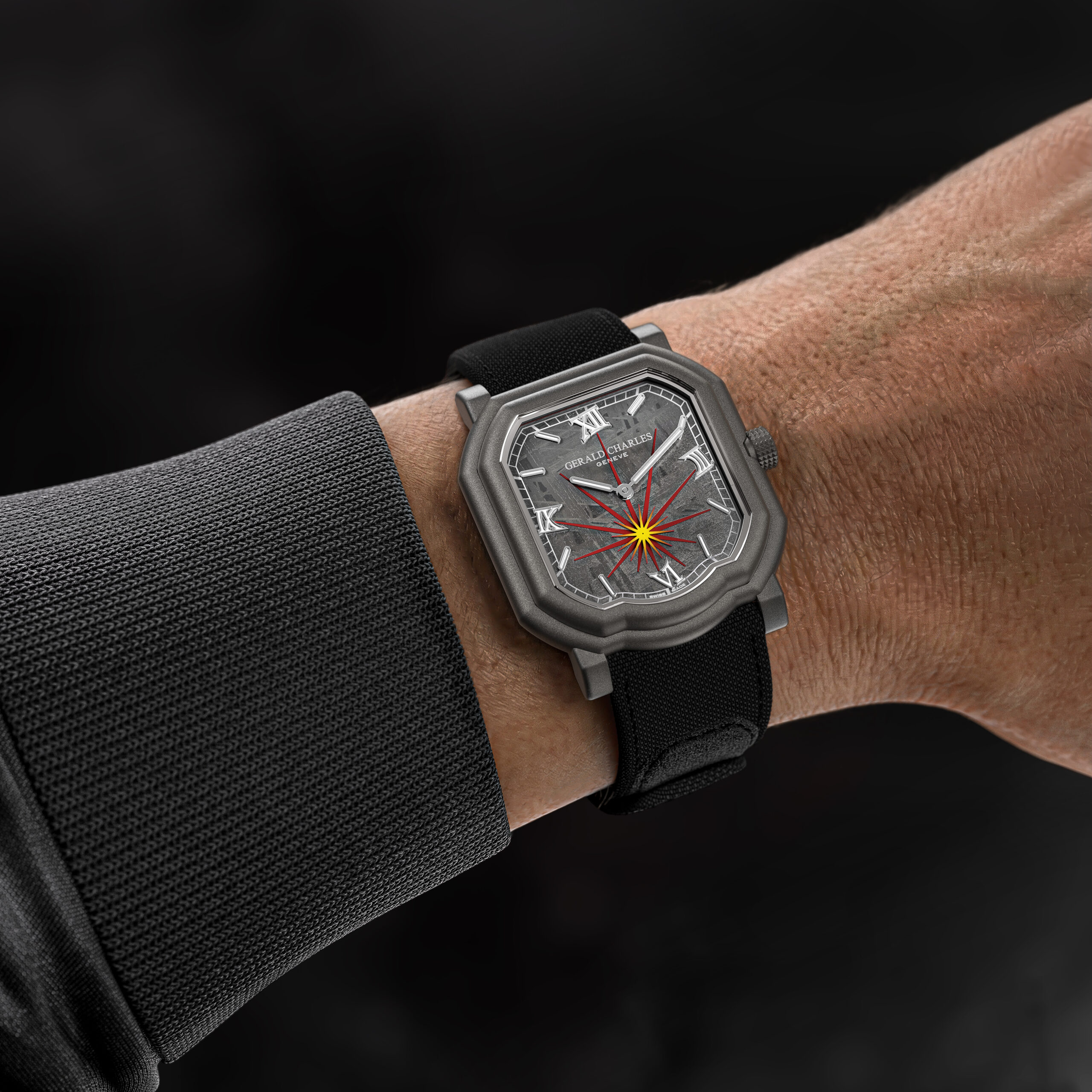 Die Ausführung dieses Savoir-faire – das Formen des Meteoriten, das der komplexen Geometrie des Maestro entspricht, und das Gravieren der Explosionsstrahlen um 6 Uhr mit nahezu chirurgischer Präzision – stellt einen der fortschrittlichsten Ausdruck von Gerald Charles‘ Expertise dar.