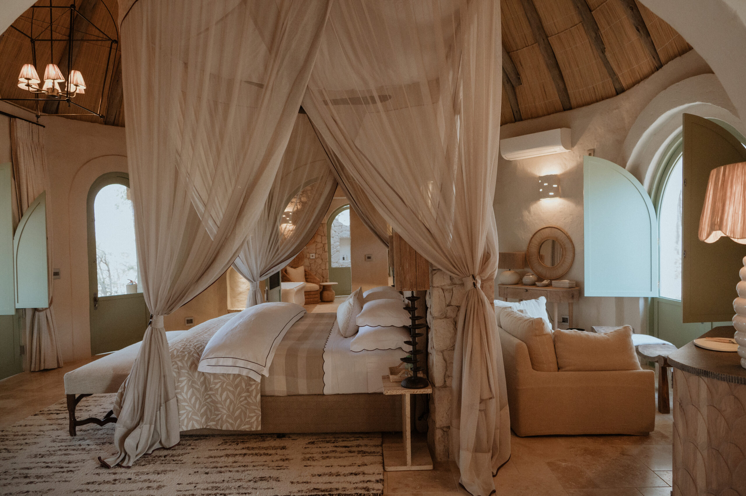 „Unsere Vision war es, etwas Rustikales und Authentisches zu schaffen, das dennoch schlicht und funktional bleibt“, erklärt Tracy Kelly. „Klare Linien, natürliche Materialien und eine neutrale Farbpalette, inspiriert von lokalem Stein, vermitteln Ruhe. Akzente in sanften Grüntönen und Terrakotta greifen traditionelle afrikanische Handwerkskunst auf und verleihen Wärme und Charakter. Naturfasern, strukturierte Teppiche und dezente Muster runden das Bild ab, während ein fließender Übergang von drinnen nach draußen und entspannte Sitzgelegenheiten im Freien mediterrane Eleganz mit dem Geist des Safari-Lifestyles verbinden.“