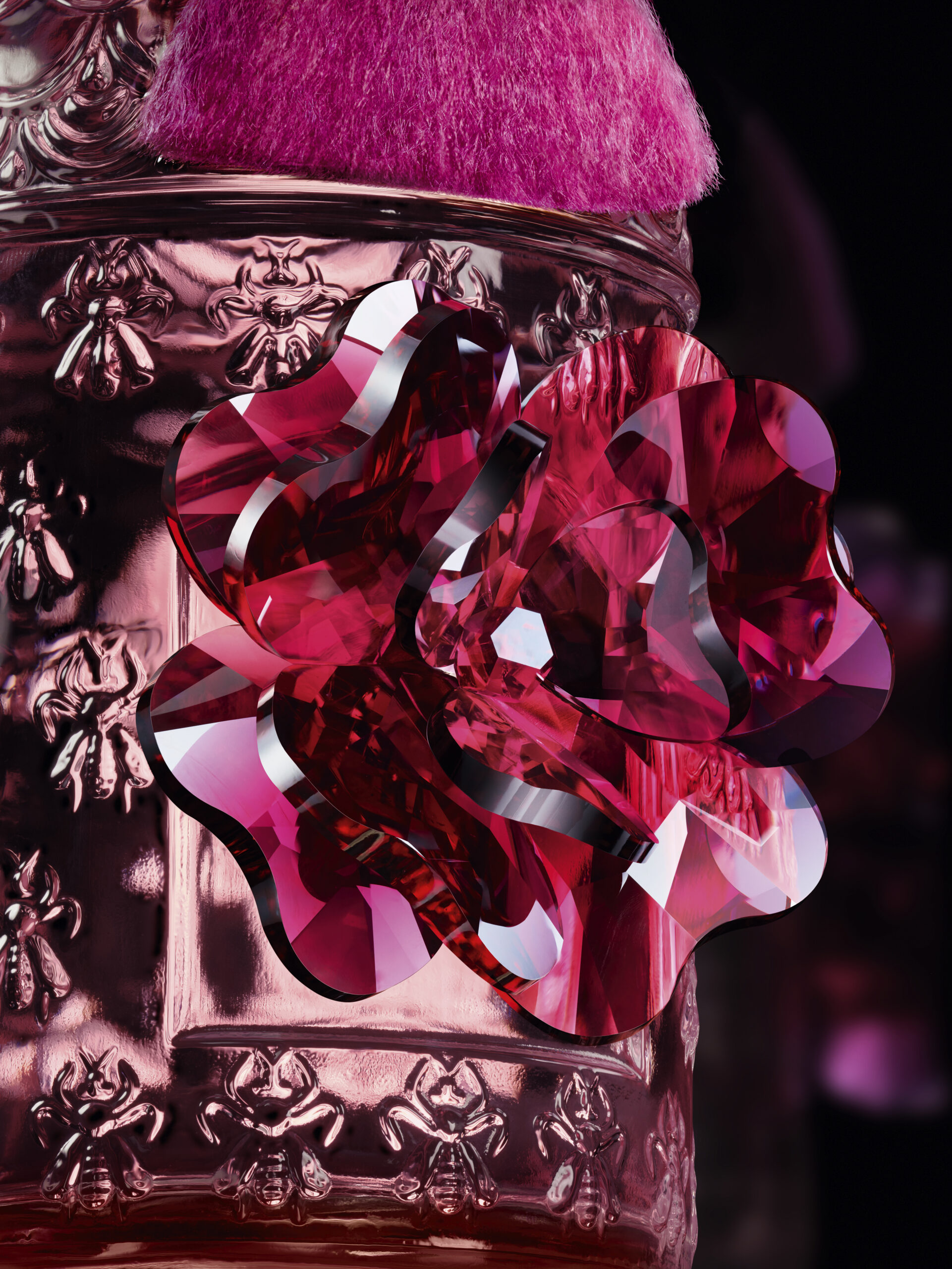 Der 1853 entworfene Bienenflakon ist ein Symbol für Raffinesse und Handwerkskunst. Für diese Edition ist er mit einer rosa Kristallblüte verziert, die das Ergebnis der unvergleichlichen Kunstfertigkeit von SWAROVSKI im Schleifen und Polieren von Kristall ist. Jeder Flakon wird sorgfältig zusammengesetzt und mit einer Satinkordel und einer gekämmten Quaste versehen, was ihn zu einem Sammlerstück macht.