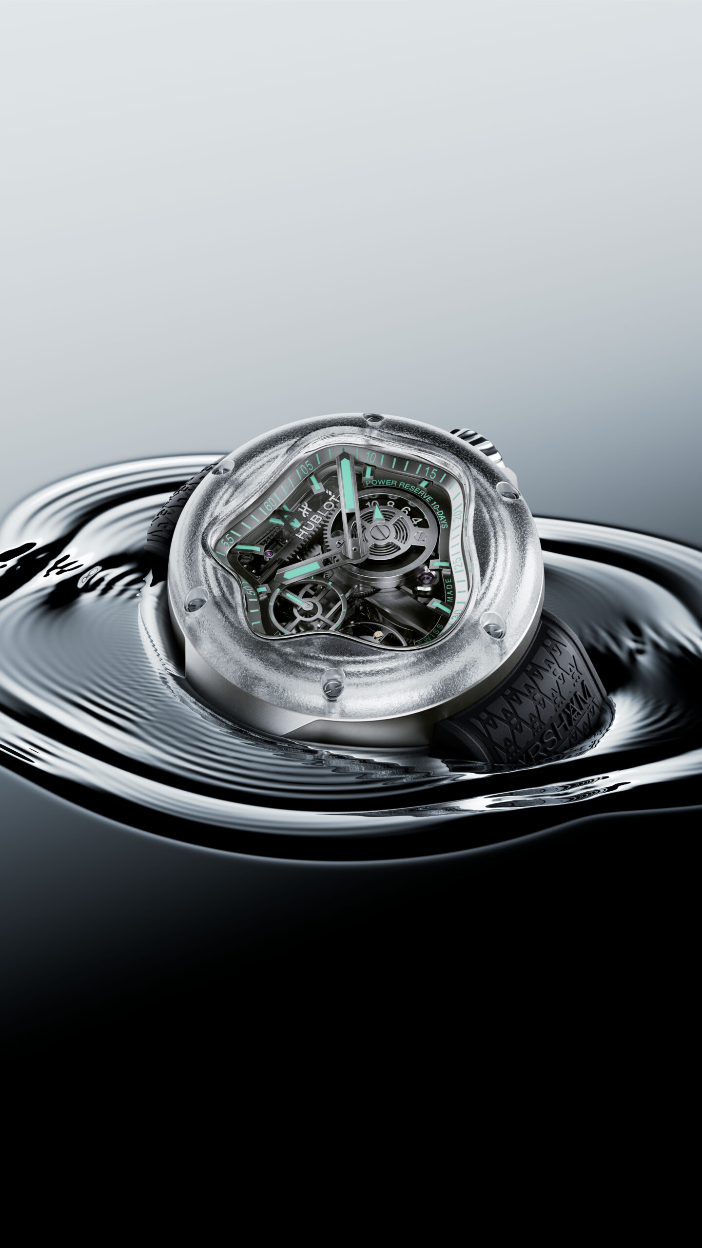 Daniel Arsham fügt hinzu: „Dieses gemeinsame Projekt mit Hublot untersucht das Fliessen der Zeit mit einem Gehäuse, das von der perfekten Geometrie eines Wassertropfens inspiriert ist und das Uhrwerk Meca-10 von Hublot umhüllt. Durch ihre transparente Struktur fängt diese Uhr die Klarheit und Bewegung des Wassers ein – momenthaft, präzise und immer im Fluss.“