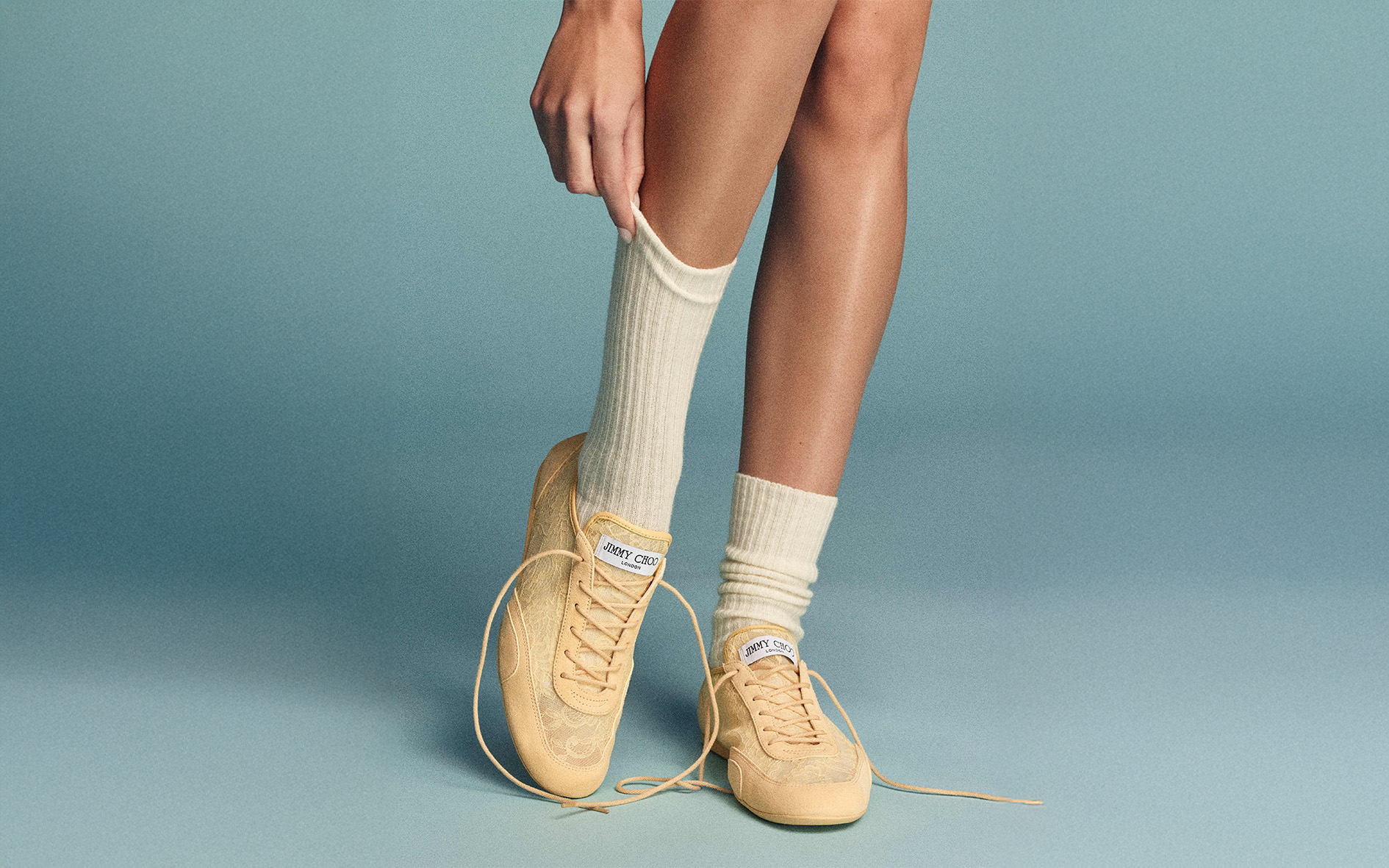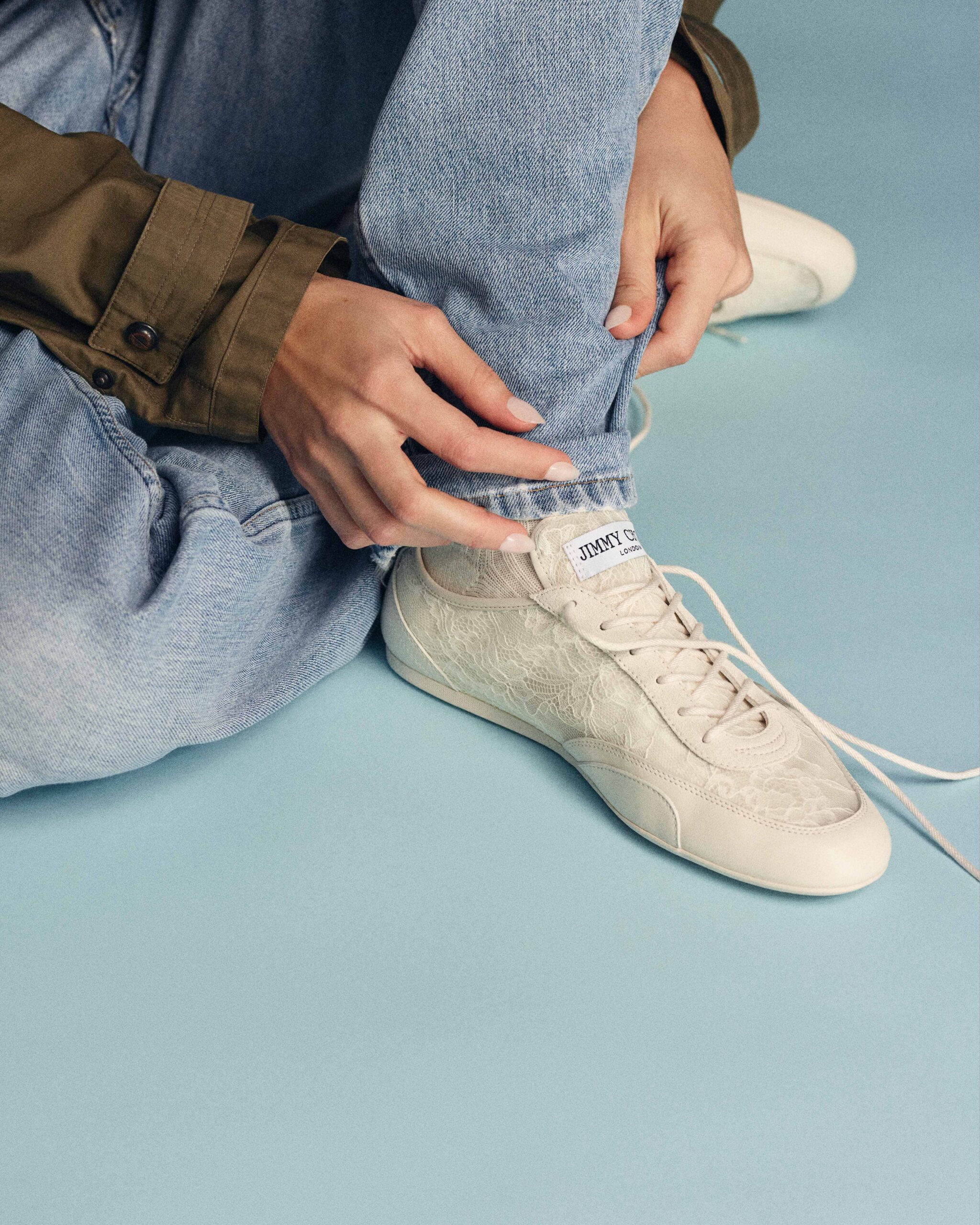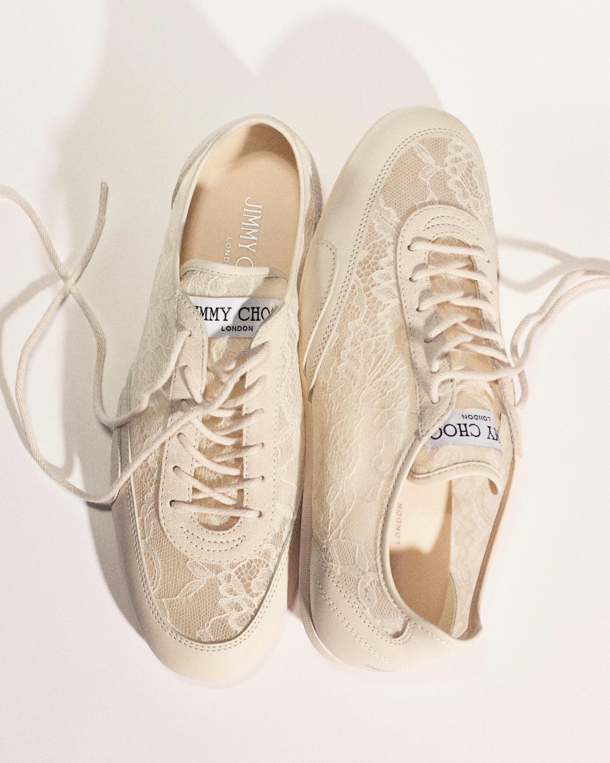 Besonders prägnant ist das Material: diaphane Spitze verleiht dem Sneaker eine luftige, feminine Anmutung und unterstreicht die scheinbare Schwerelosigkeit der Form. Genau hier spielt Jimmy Choo mit seiner typischen Dualität: athletisch und zugleich elegant, funktional, aber veredelt.