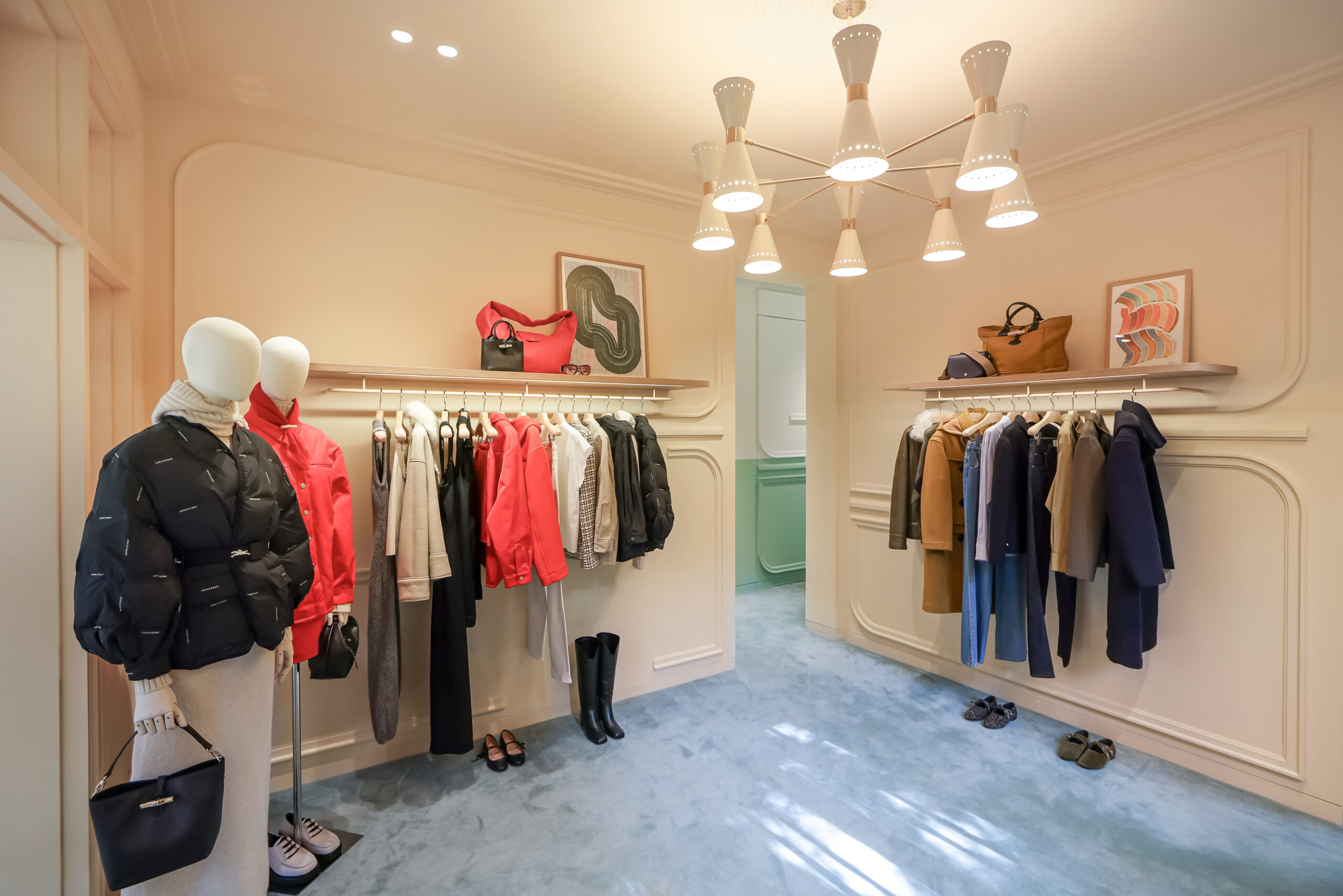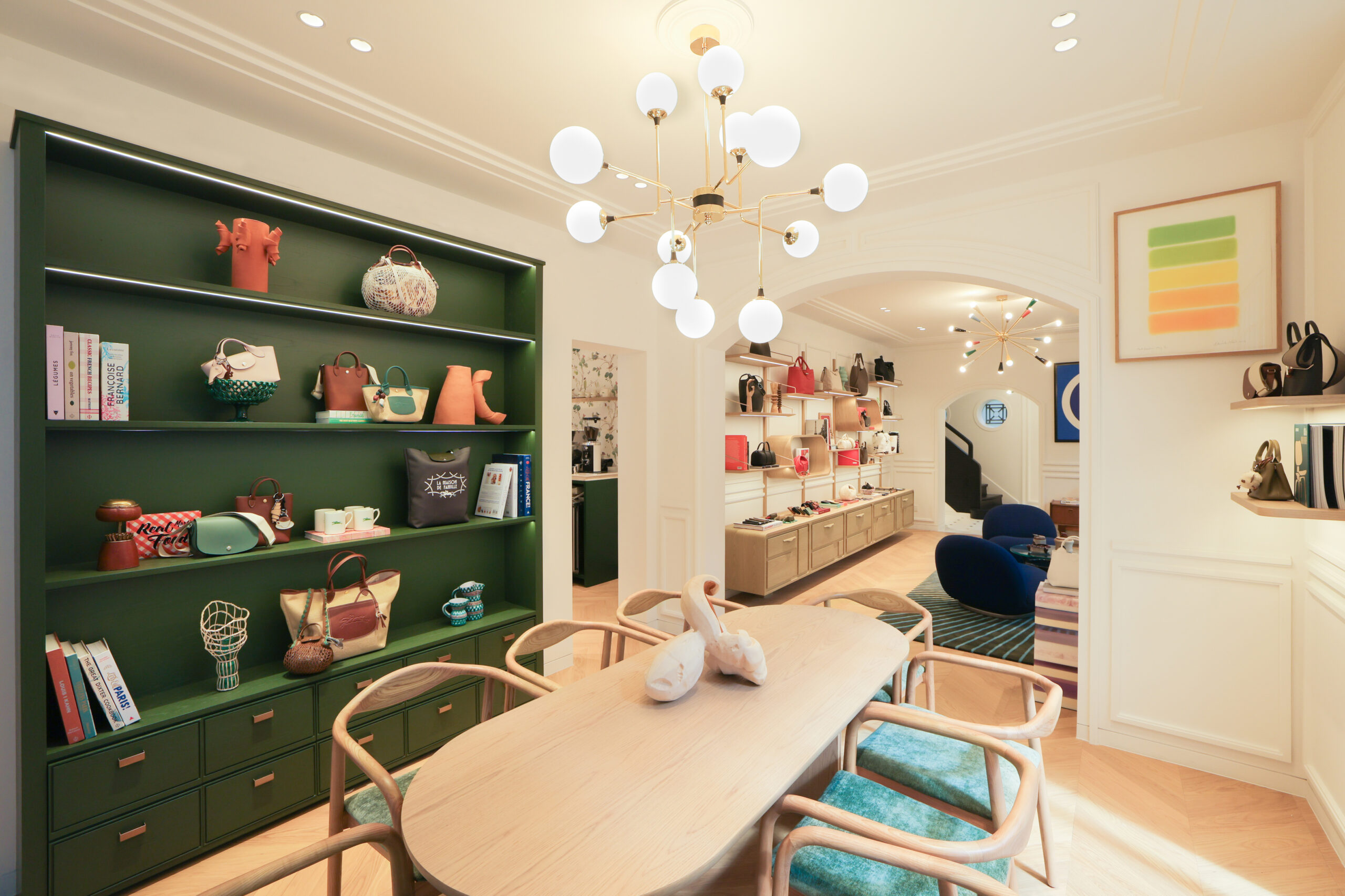 Das Ankleidezimmer präsentiert Longchamps Prêt-à-porter-Kollektionen, Schuhe und Accessoires, die Pariser Eleganz und Selbstbewusstsein verkörpern. Ein auffälliger Druck von Etel Adnan sowie ein Paar Mushroom-Sessel von Pierre Paulin aus dem Jahr 1958 verleihen dem Raum Wärme und Mid-Century-Charme, ergänzt durch einen Sockeltisch von René-Jean Caillette ebenfalls aus den 1950er-Jahren. Longchamp-Klassiker aus vergangenen Kollektionen – eine Uhr und ein Steigbügel-förmiges Schreibtischaccessoire – würdigen das anhaltende Erbe der Marke in Handwerkskunst und Innovation.