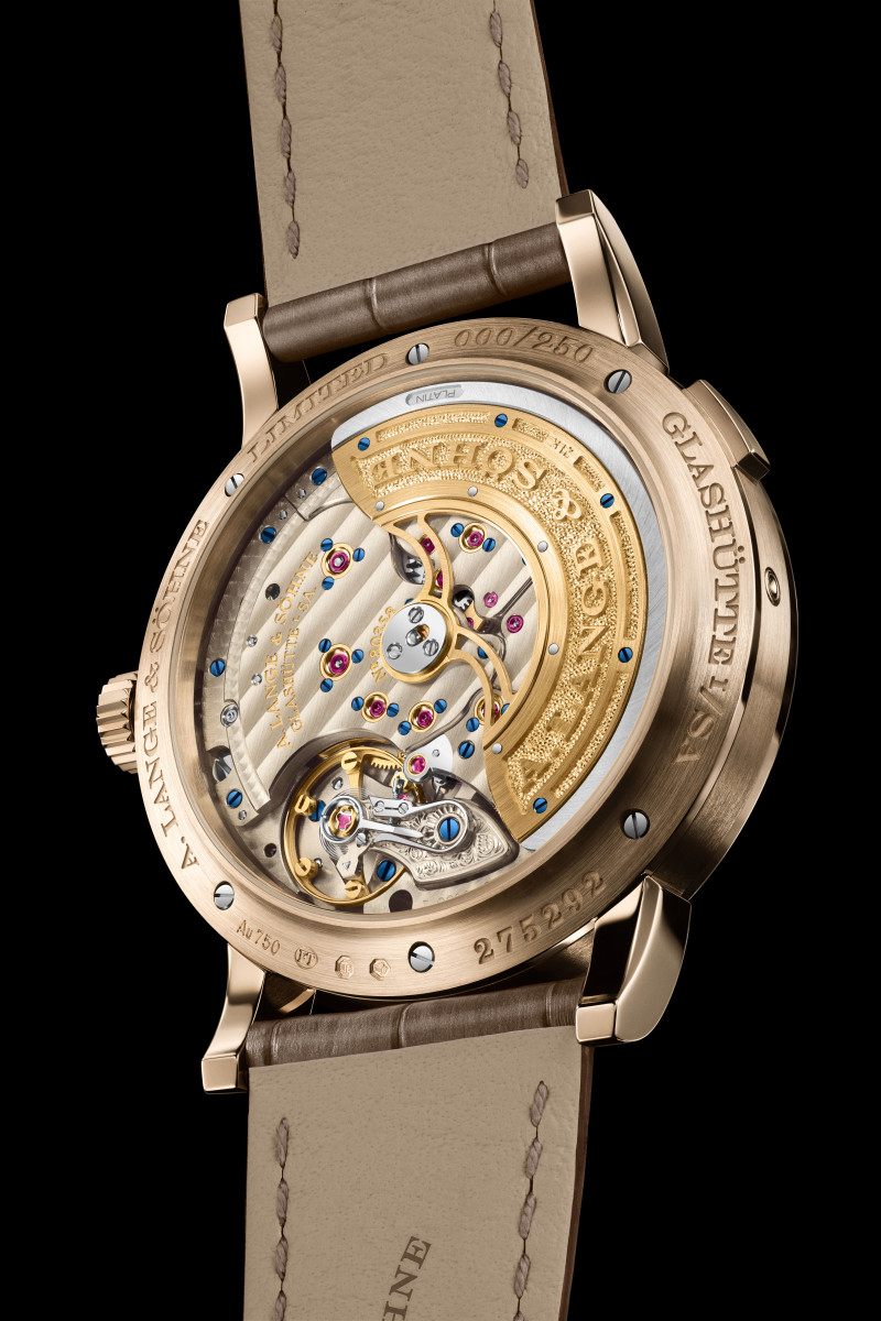 Für den effektiven Aufzug und eine kontinuierliche Energiezufuhr sorgt ein großer Zentralrotor, der den gesamten Durchmesser des Uhrwerks einnimmt. Sein Zentralsegment aus 875er Gold (21 Karat) ist mit dem „A. Lange & Söhne“-Schriftzug geprägt, die äußere Schwungmasse besteht aus 950er Platin.