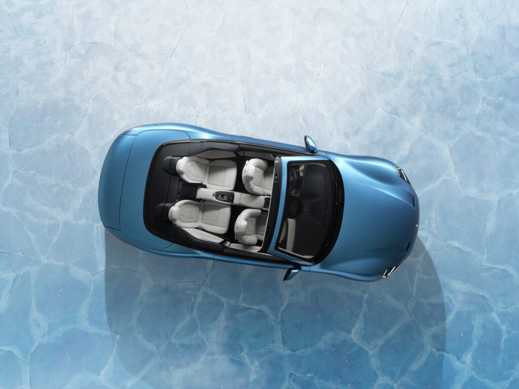 Das Äussere wird durch eigens geschaffene Embleme und kontrastierende seitliche Lufteinlässe in glänzendem Weiss vervollständigt, ebenso durch geschmiedete Räder im Astreo-Design, gepaart mit glänzend blauen Bremssätteln. Um die Individualisierung zu komplettieren, gibt das in Blue Marine gehaltene Verdeck den Blick auf die eisfarbene Lederausstattung und die 3D-Carbonoberflächen frei.