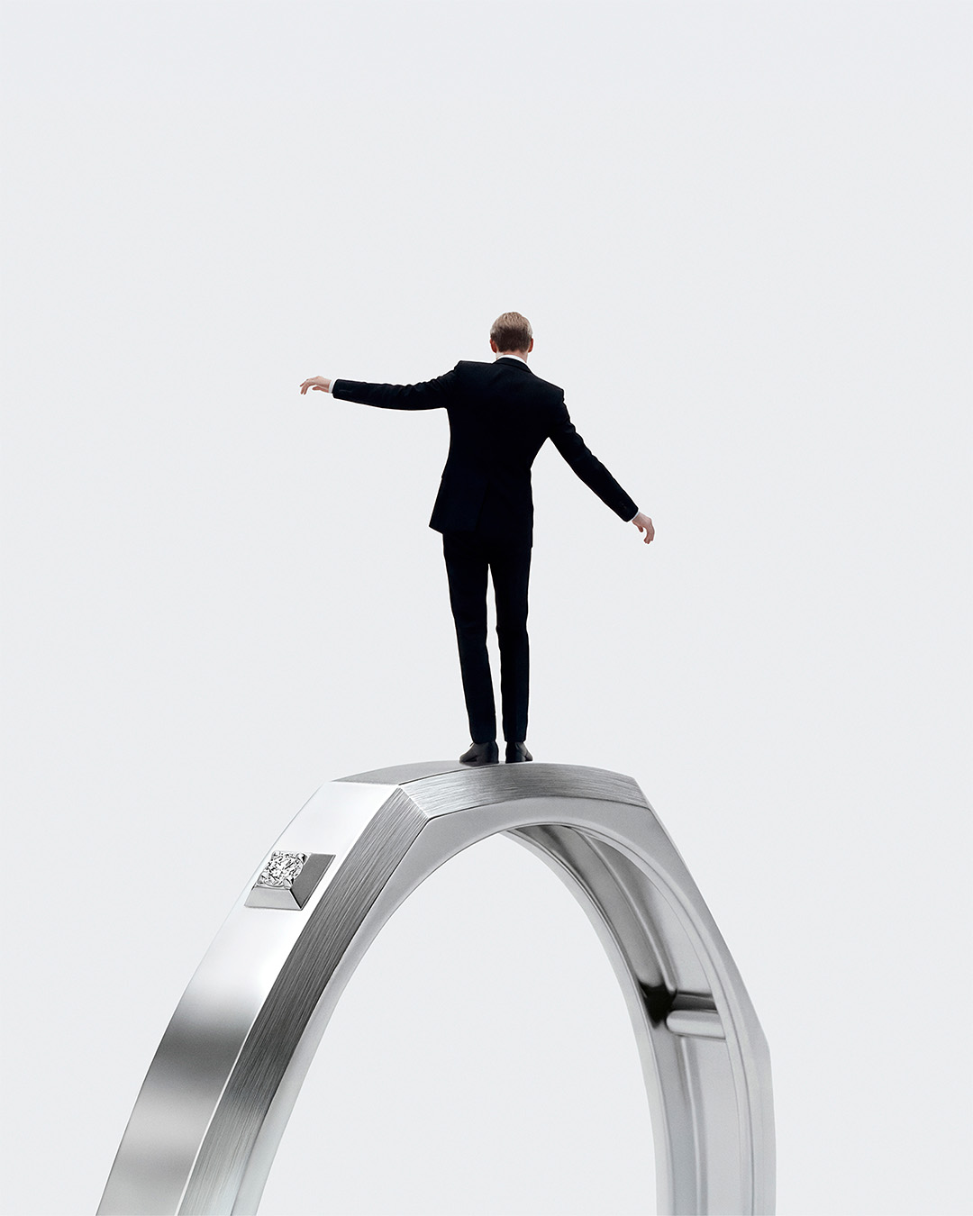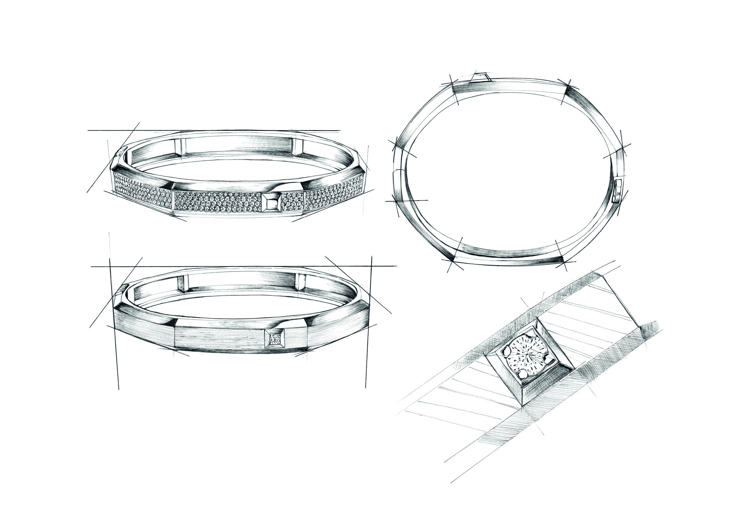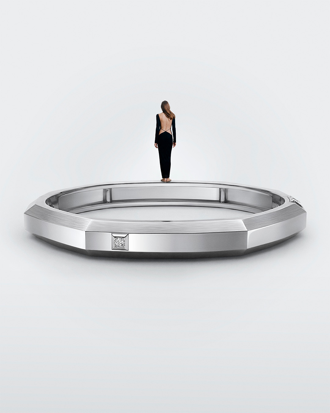 Gold steht im Zentrum, poliert oder gebürstet, manchmal diamantbesetzt. Doch die Diamanten verschwinden nicht – sie dialogisieren mit dem Metall, fangen das Licht ein und intensivieren es. Licht ist hier kein dekoratives Beiwerk, sondern strukturierendes Element. Es modelliert Kanten, Vertiefungen und Ebenen.