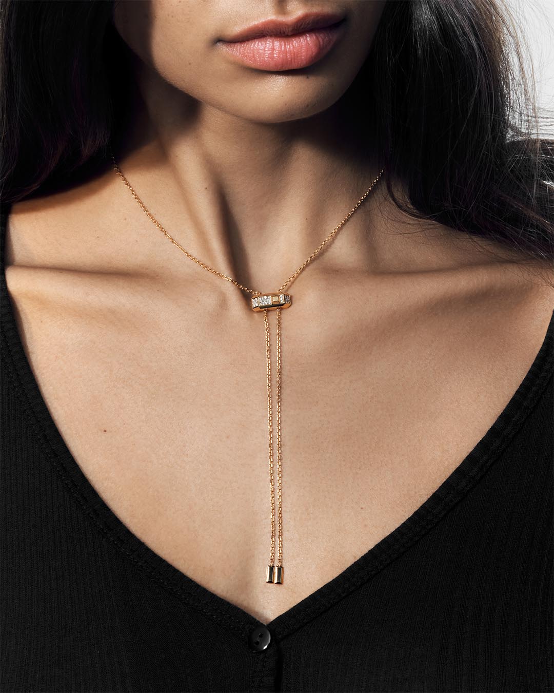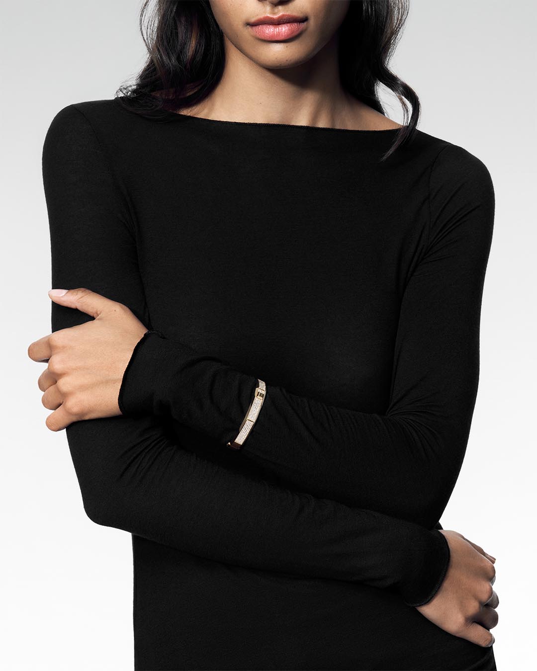 Im Mittelpunkt steht ein markanter Armreif – die Signatur der Linie. Ergänzt wird er durch Ringe, Ohrringe und Halsketten, darunter eine Torque-Kette sowie eine Krawattenkette mit präzise gleitendem Diamant-Element.