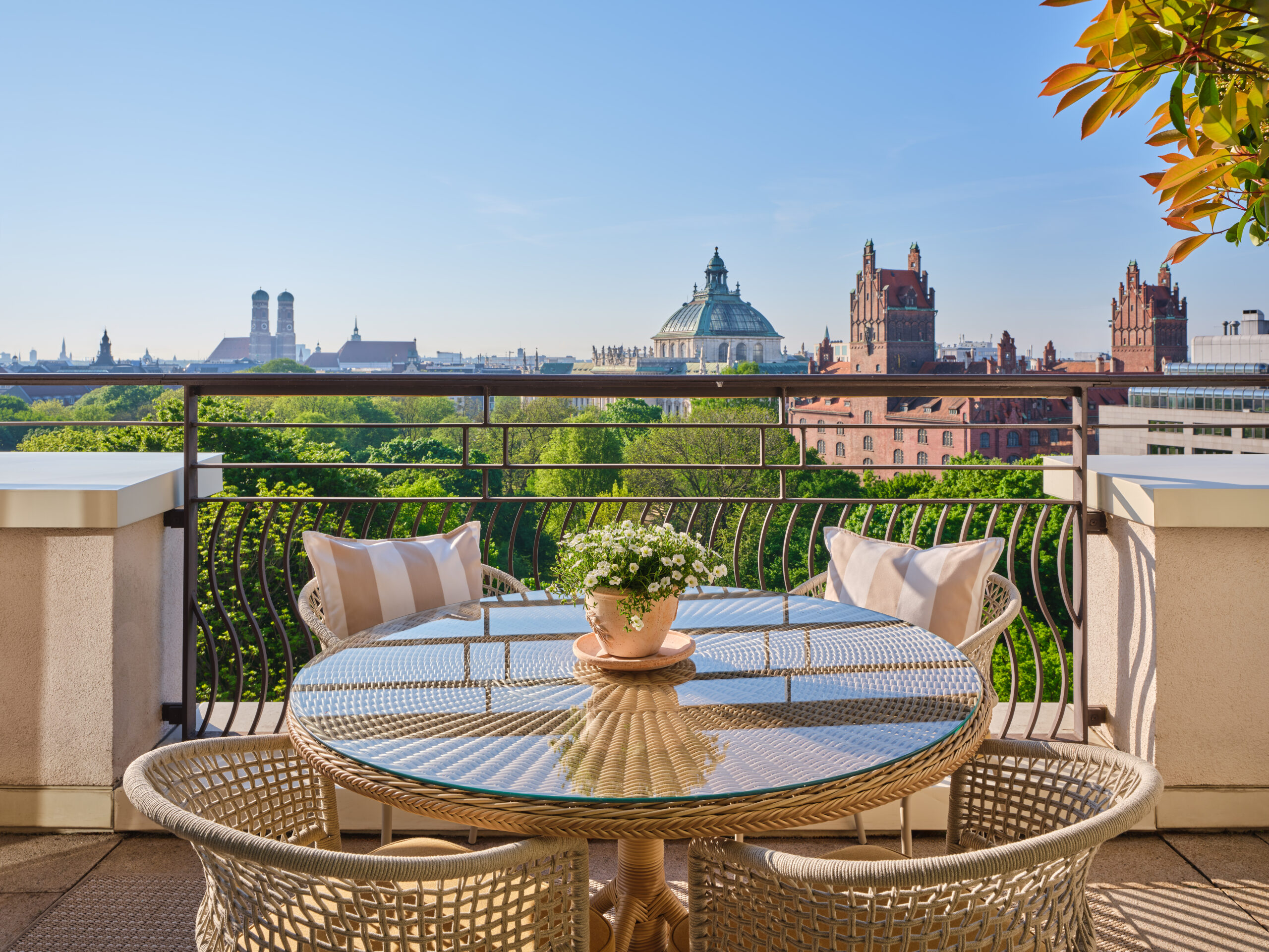 Die private Außenterrasse bietet einen atemberaubenden Blick über die Baumkronen des Alten Botanischen Gartens und auf diverse, architektonische Wahrzeichen Münchens. Die 200 Quadratmeter große Suite besticht durch ein offenes Raumkonzept, bei dem die verschiedenen Räume durch große Doppeltüren miteinander verbunden sind und so nicht nur ein Gefühl von Weite vermittelt wird, sondern gleichermaßen ein Gefühl der Verbundenheit und des fließenden Austauschs.