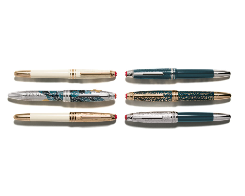 Federmotive stehen für Julias ätherischen Liebreiz und erinnern an Romeos Worte „Oh, sprich noch einmal, holder Engel!“, als er sie mit einem Boten des Himmels vergleicht. Das Blattmuster ist an den Garten der Familie Capulet aus der zweiten Szene des zweiten Akts angelehnt, in dem Julia ahnungslos ihre Liebe und ihren inneren Aufruhr offenbart. Es symbolisiert die geschützte Umgebung, in der sich das Paar erstmals seine Liebe gesteht. Die Dornenmotive auf dem Kappenkopf und dem Konus verweisen auf die Familienfehde, die ihre Verbindung bedroht, und die Unmöglichkeit, Rosen von Dornen zu trennen. Jedes Schreibgerät der Kollektion verfügt über rote Akzente als Hommage an die Farbe der Liebe, der Leidenschaft und des Opfers.