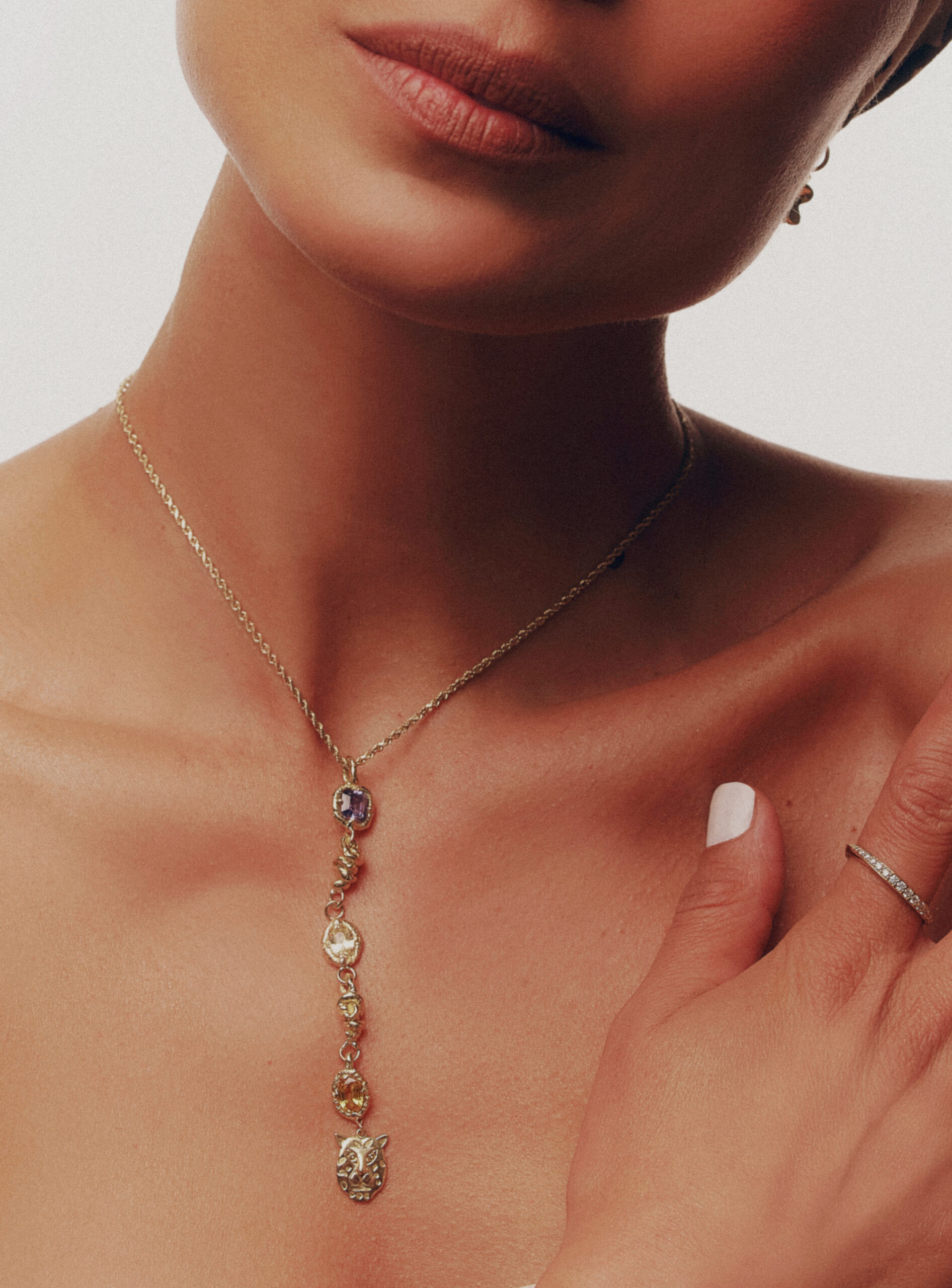 Das fertige Stück ist eine exquisite Halskette mit Jaguar-Anhänger und Edelsteinen. Die einzigartige Halskette ist aus 18 Karat quecksilberfreiem Gold von AMATAF Minenarbeitern gefertigt, die von Pure Earth ausgebildet wurden, und besteht aus einem Umba-Saphir von Anza Gems und 2 gelben recycelten Saphiren von Perpetuum Jewels. Die Farben der Steine stellen den Sonnenaufgang im Amazonasgebiet dar, und der Jaguar ist ein kraftvolles Symbol für Natur, Harmonie und die Widerstandsfähigkeit des peruanischen Amazonas.
