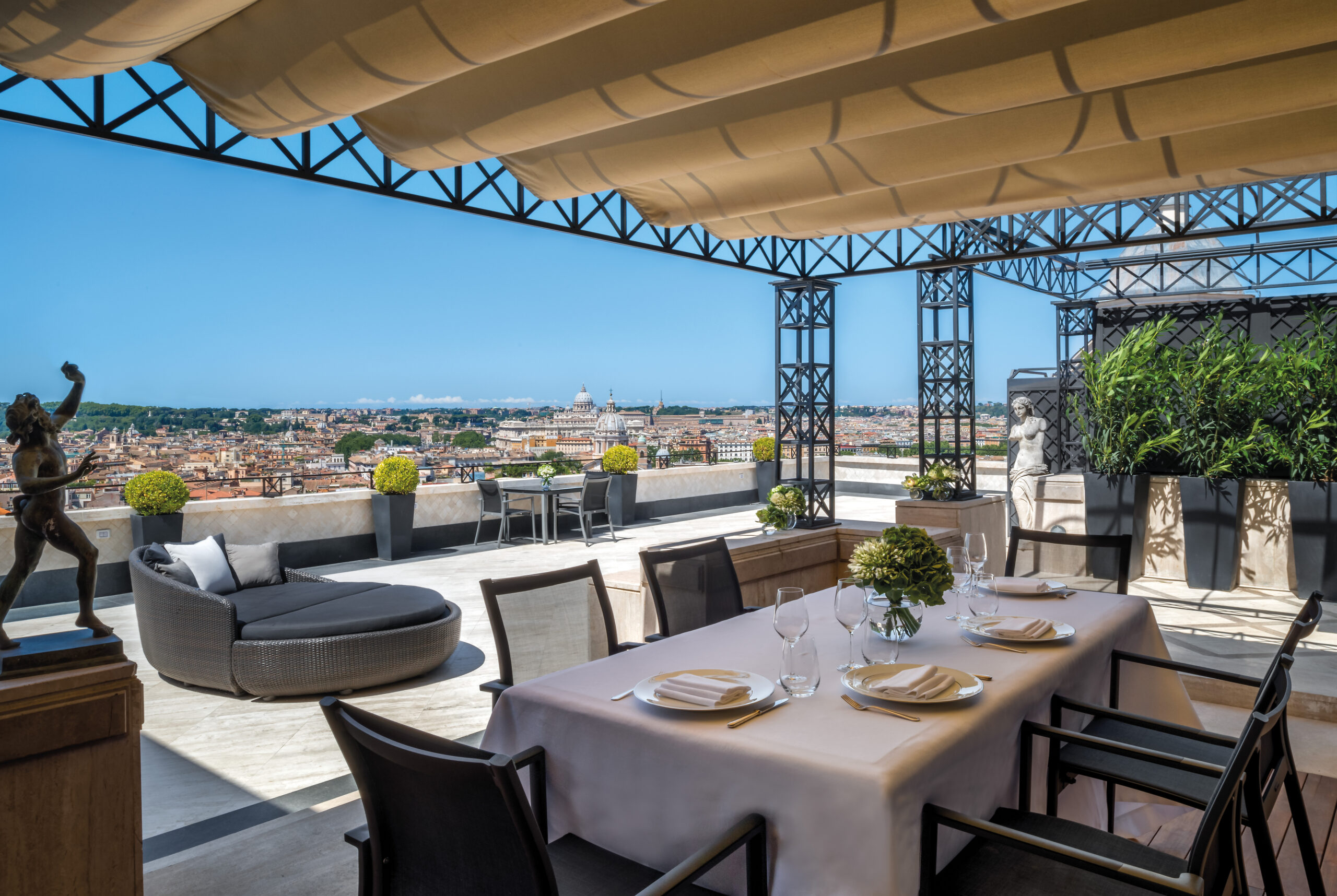 Im Frühjahr, setzt das Hassler Roma die nächste Phase seiner Wiedereröffnung fort und präsentiert den neu gestalteten Palm Court den charmanten Innenhofgarten und Sommerrestaurant des Hauses. Unter der kreativen Leitung von Jacques Garcia wurde der Palm Court behutsam neu interpretiert: mit fantasievoller Bepflanzung und sorgfältig kuratierten Kunstwerken, die den Geist Roms in eine zeitgemäße Form übersetzen. Entstanden ist eine ruhige Gartenoase im Herzen des Hotels, die zu jeder Tageszeit Raum für Entschleunigung und Begegnung bietet und dem Hassler Roma neue Leichtigkeit, üppiges Grün und römischen Charakter verleiht.