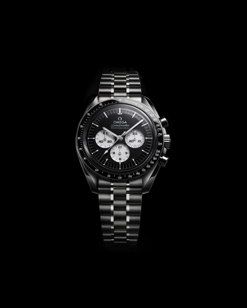 Abgerundet wird das Schwarz-Weiss-Thema durch eine Lünette aus schwarzer Keramik mit Tachymeterskala in weissem Email. Die Frontseite verfügt über ein kastenförmiges, kratzresistentes und entspiegeltes Saphirglas. Die Uhren sind mit einem polierten und gebürsteten Armband im klassischen Moonwatch-Stil ausgestattet, das mit OMEGAs patentiertem Komfortverschluss am Handgelenk gesichert wird.