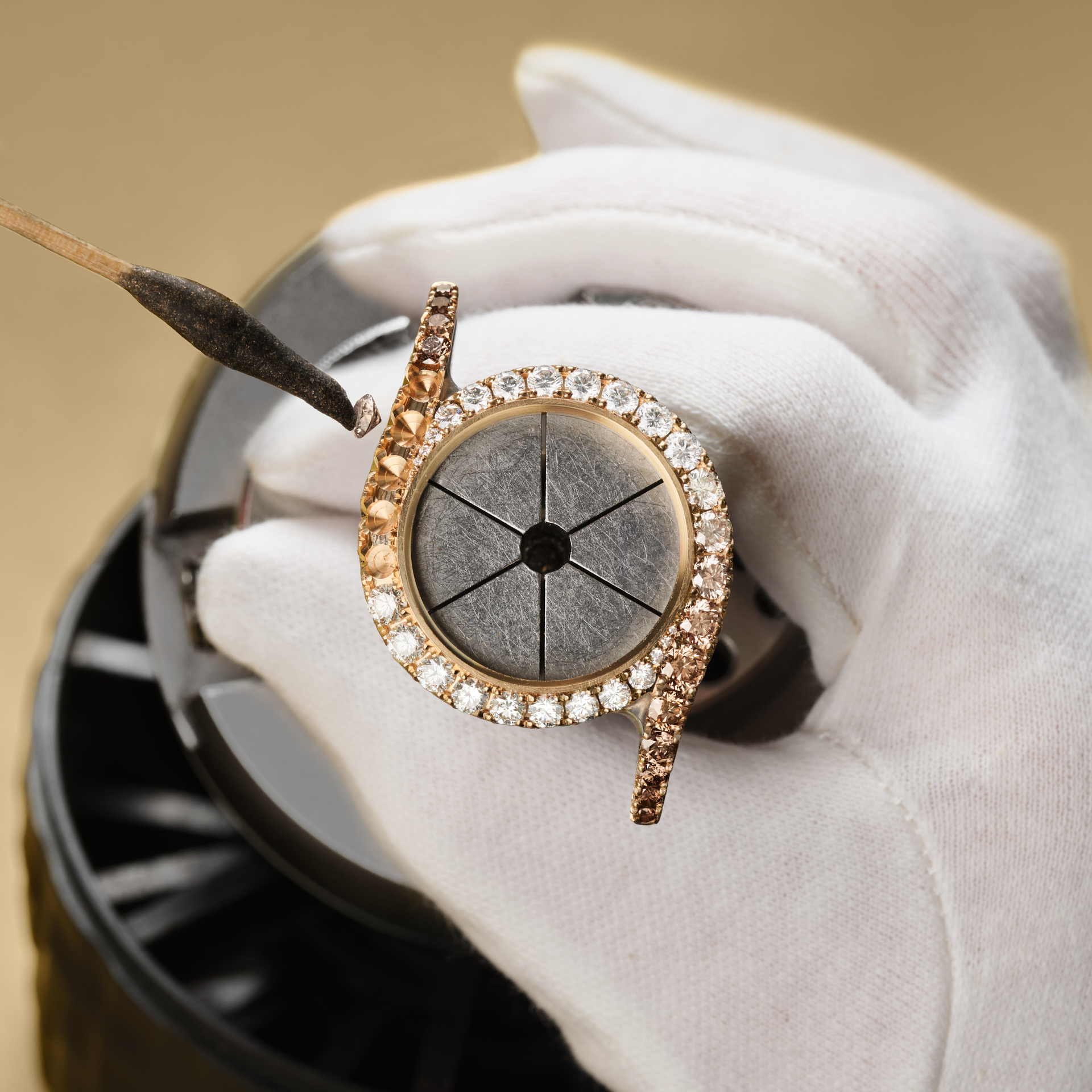Hier zeigt sich die Virtuosität der Uhrmacherei in vollendeter Form. Die fließenden, rhythmischen Linien unterschiedlicher Tiefe lassen das Licht über das Gold tanzen, wie im Scheinwerferlicht, in vollkommener Harmonie mit der Feinheit von Ton und Nuance, Licht und Schatten, in der akribischen Abstufung der Diamant-Farben, von Weiß bis Cognac. Bei beiden Modellen sind die subtilen Farbverläufe, die Edelsteinfassungen, die Spessartingranate sowie die weißen und cognacfarbenen Diamanten das Ergebnis eines komplexen, hochpräzisen Arbeitsprozesses. Sie erfordern Zeit, Geduld, technisches Können und Sensibilität eines wahren Künstlers bei der Auswahl von Nuancen von Schattierung, Farbtönen und Ton, wobei Hand in Hand mit der Farb- und Lichtpalette der Natur gearbeitet wird.