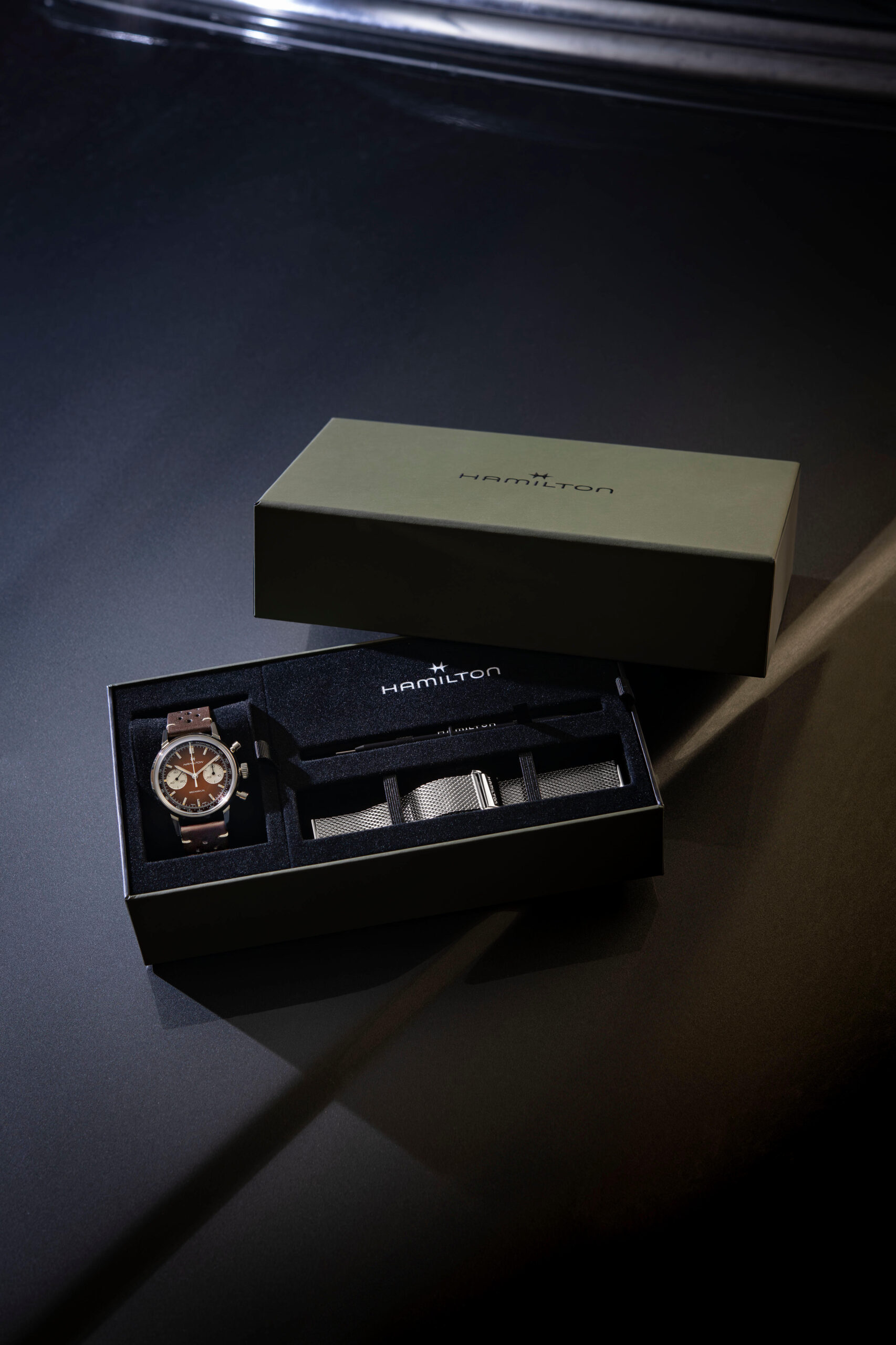 Zusätzliche Details betonen die Motorsport-Inspiration, darunter perforierte Lederarmbänder für Atmungsaktivität und Griffigkeit sowie ein kastenförmiges, beidseitig entspiegeltes Saphirglas. Für zusätzliche Vielseitigkeit wird ein austauschbares Mesh-Armband mitgeliefert, das optional einen elegant-modernen Look im Mid-Century-Modern-Stil bietet. Ob in Kombination mit einer lässigen Wochenend-Jeans und einem oft getragenen Freizeitmantel oder mit formeller Kleidung für spezielle Anlässe getragen – die American Classic Chronograph H verkörpert auf vielseitige Weise die Tradition des Rennsports.