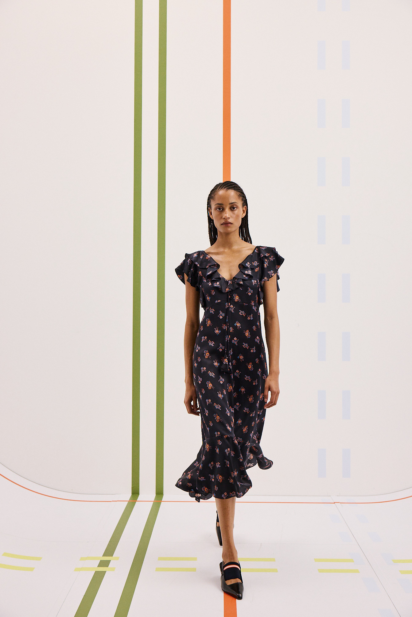 Die neuen Dresses zeigen sich wandelbar: abnehmbare Flowers, Volants, Lace und Embroideries ermöglichen mühelos den Übergang von Daywear zu Evening. Darüber: Lackmäntel, Utility Jackets oder Veloursleder-Coats.