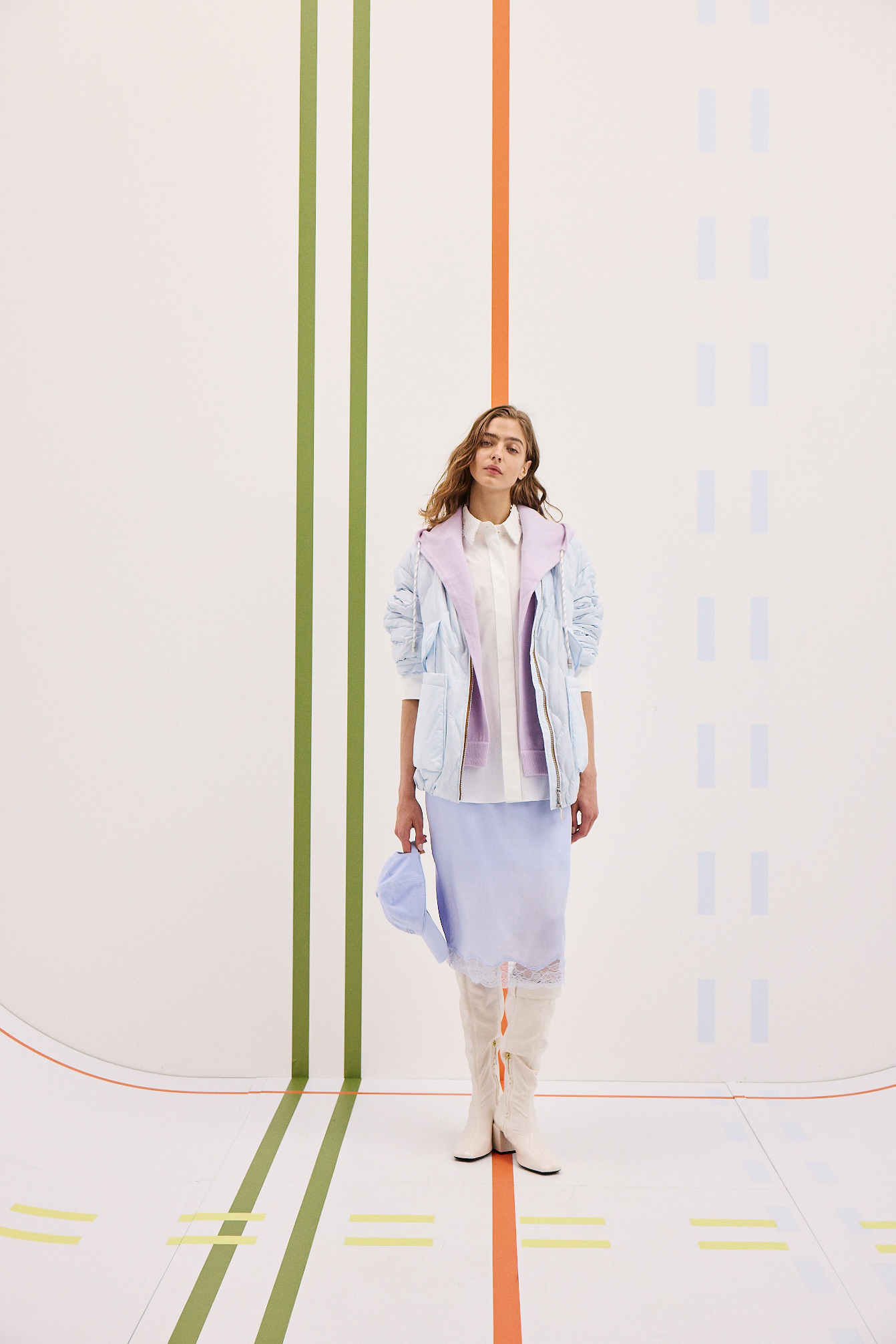 Zarte Lingerie-Röcke mit See-through-Effekt werden selbstbewusst zu Field Jackets kombiniert, romantische Allover-Spitze kontrastiert mit Bomber Jackets, während Lackleder auf cleane Popeline trifft. Es ist ein Dialog zwischen Softness und Street, zwischen Intimität und Funktion.