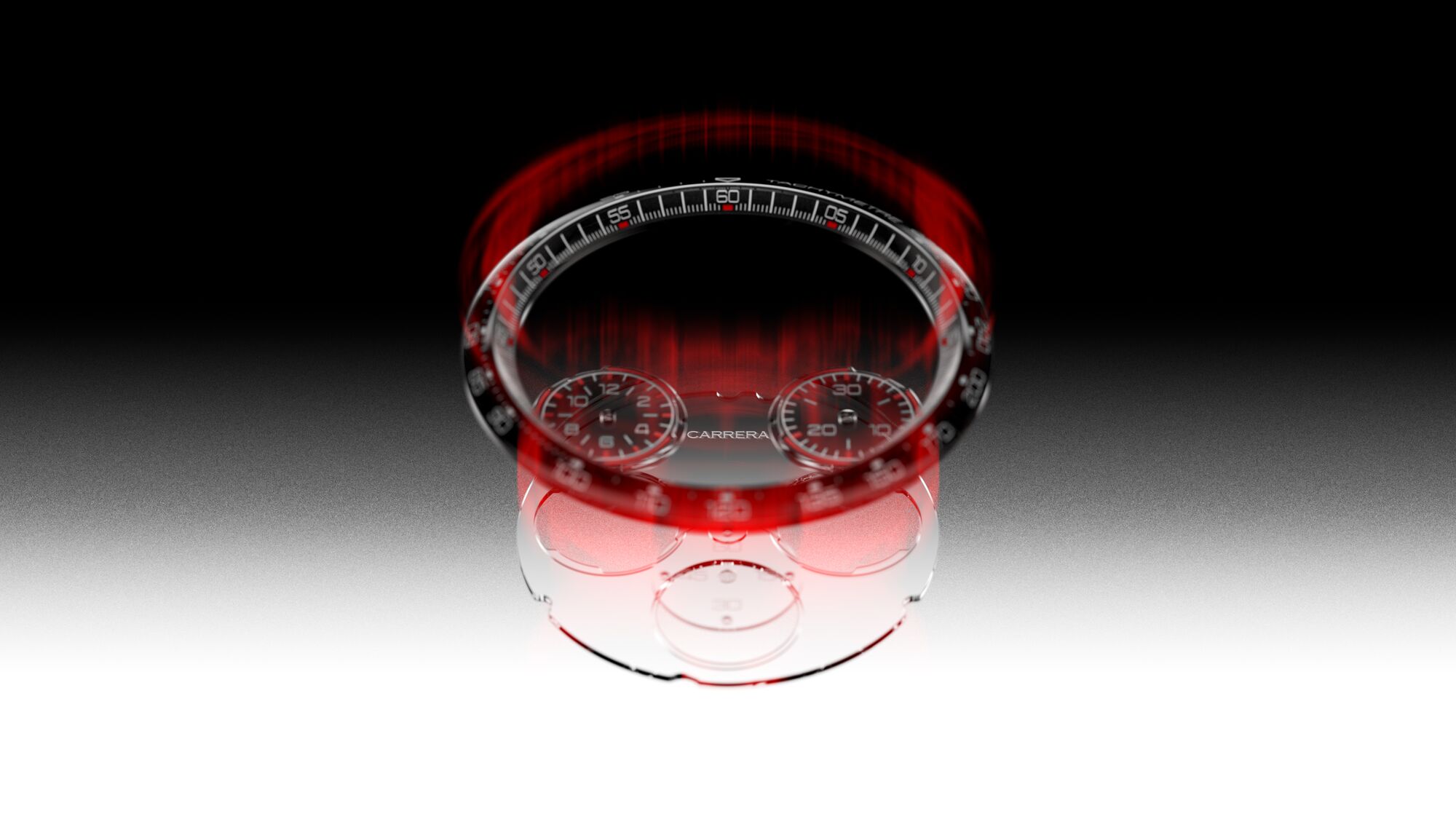 Mit einer Tachymeter-Skala ist der Flansch gebogen, um dem Profil des Glases zu folgen, wodurch der Parallaxenfehler minimiert wird, und das durchscheinende Saphirglaszifferblatt ermöglicht eine deutliche Sichtbarkeit des außergewöhnlichen Finishes des Uhrwerks. Um den Schlüsselcode der Transparenz in den Avant-Garde-Horlogerie-Uhrmessern von TAG Heuer weiter zu vermitteln, sind die Nebenzifferblätter einzeln aus demselben Material wie das Hauptzifferblatt gefertigt, was der Uhr eine größere Tiefe verleiht.