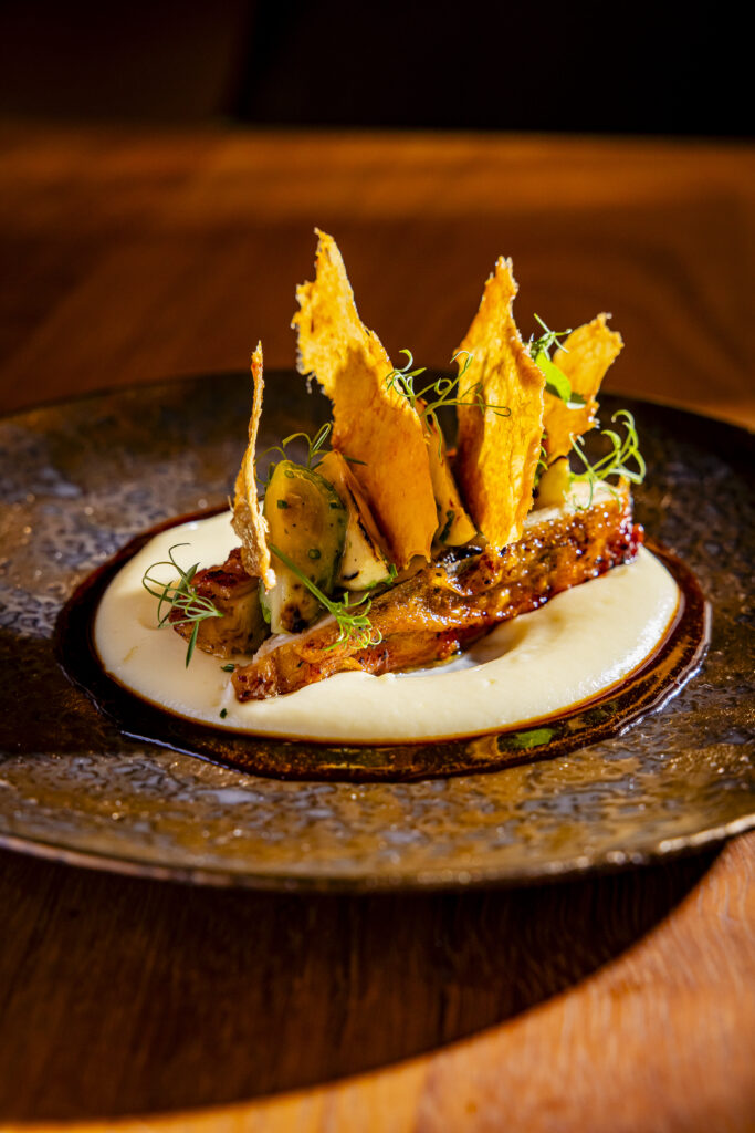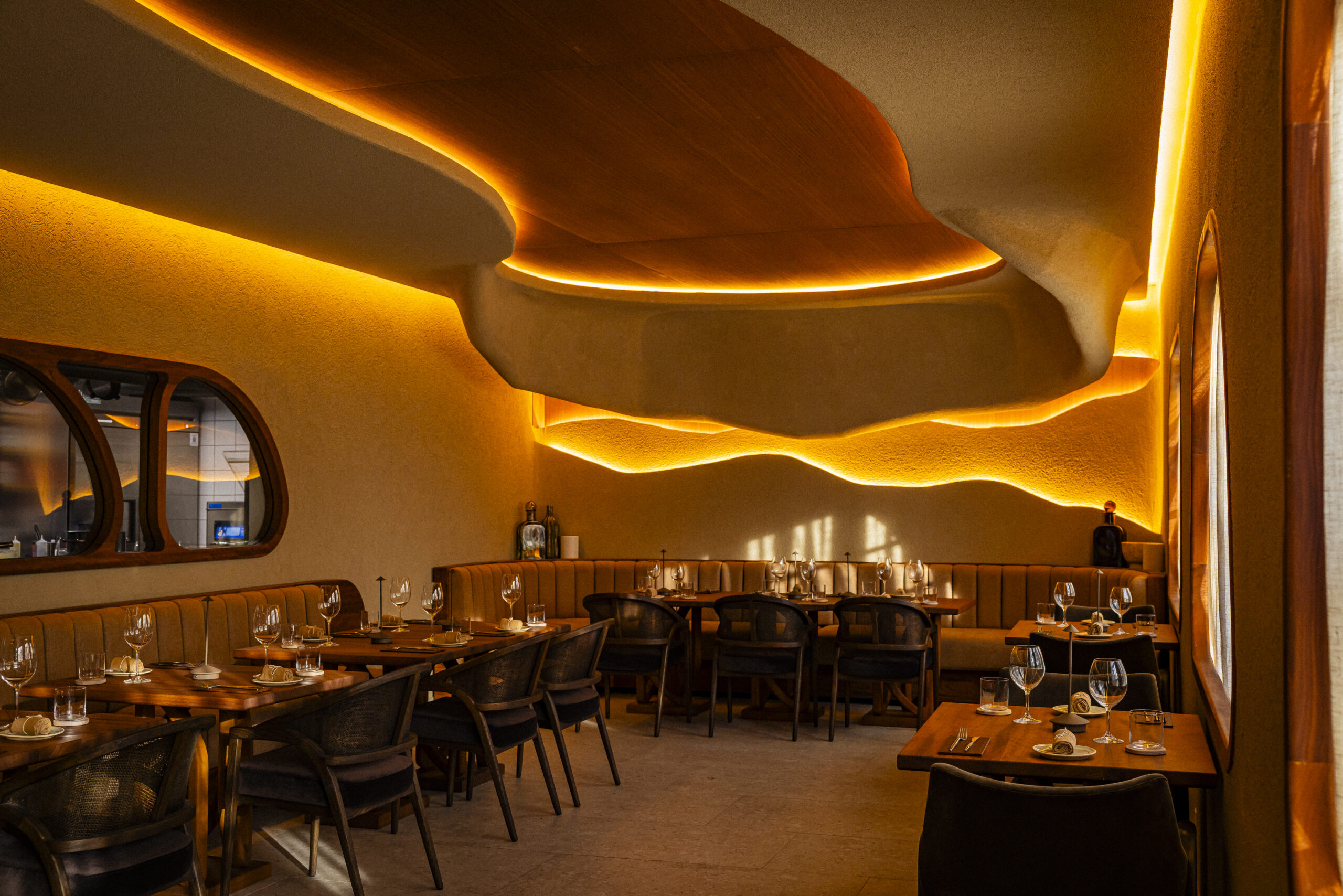 Das Interieur des Restaurants spiegelt diese Philosophie wider: warme Holztöne, geschwungene Formen, handgefertigte Keramik – jeder Teller und jeder Winkel des Raumes erzählen von Handwerk, Natur und Eleganz. Dank nur 35 Plätzen entsteht eine sehr private Atmosphäre, perfekt für romantische Abende, Jubiläen oder besondere Momente.