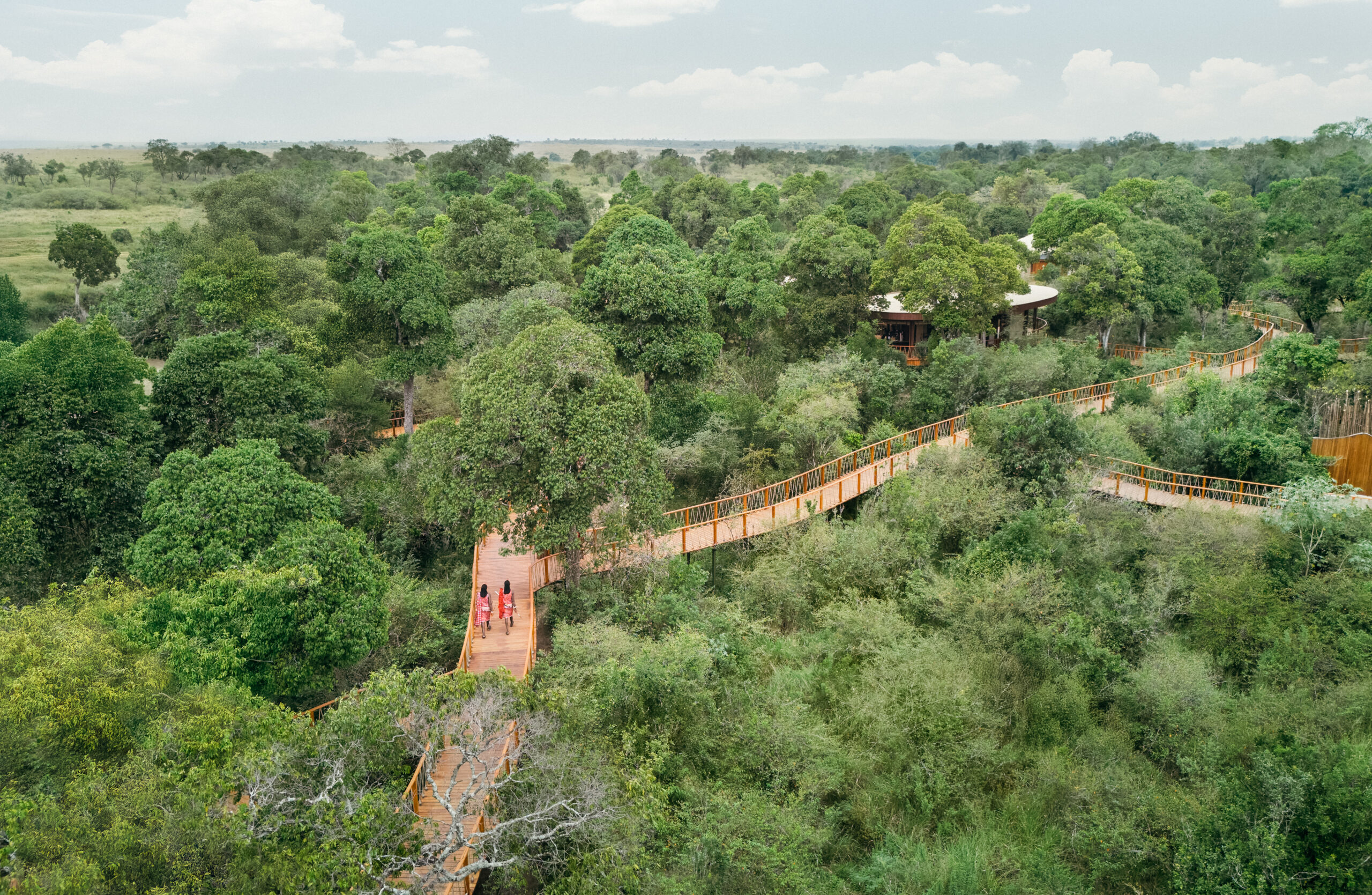 Ähnlich porös sind die öffentlichen Bereiche: offene Räume, in denen Innen und Außen nur durch Leinwand, nicht aber durch Wände getrennt sind. Die Natur ist allgegenwärtig – das Rascheln der Blätter, Vogelgezwitscher, fernes Brüllen und dichte Tierspuren prägen einen neuen Rhythmus der Zeit. Erhöhte Wege schlängeln sich durch die natürlichen Konturen des Landes, und die Landschaft ist nicht landschaftlich gestaltet – sie wächst in und um die Natur.