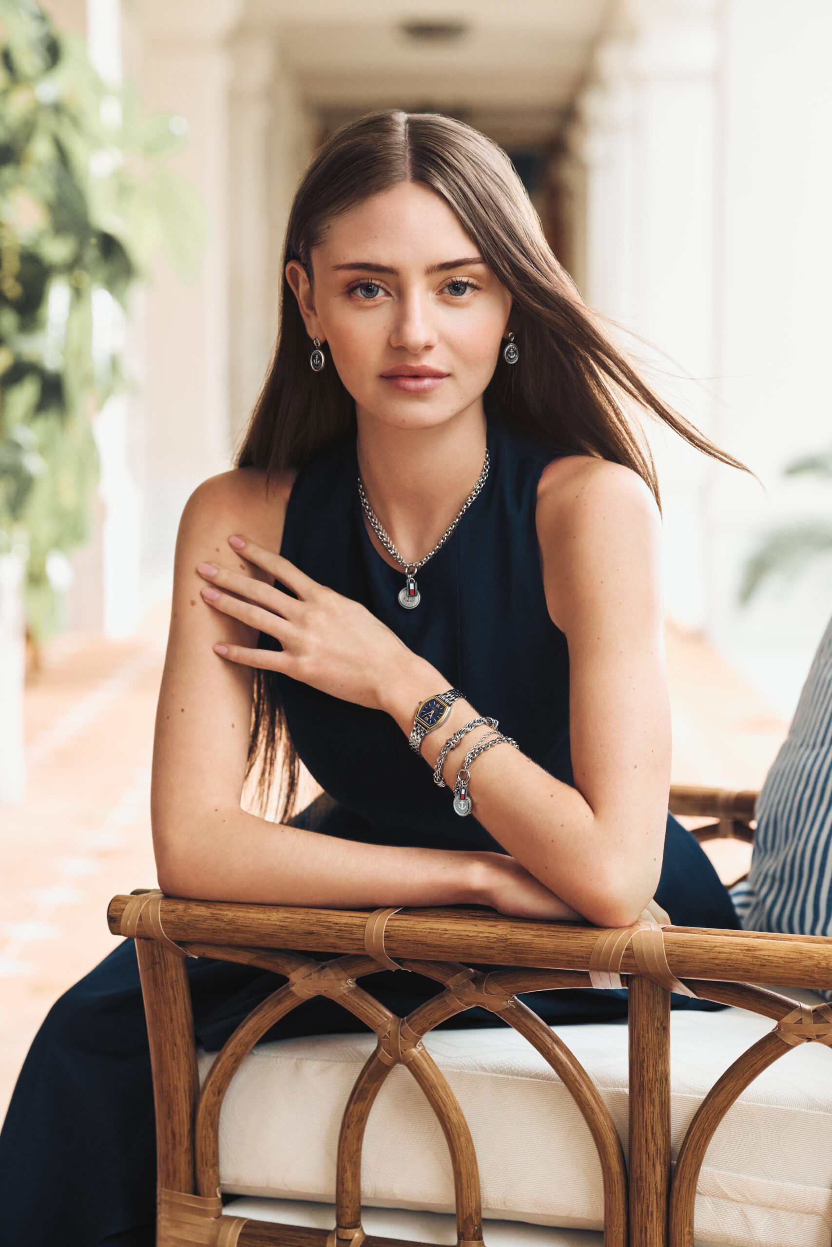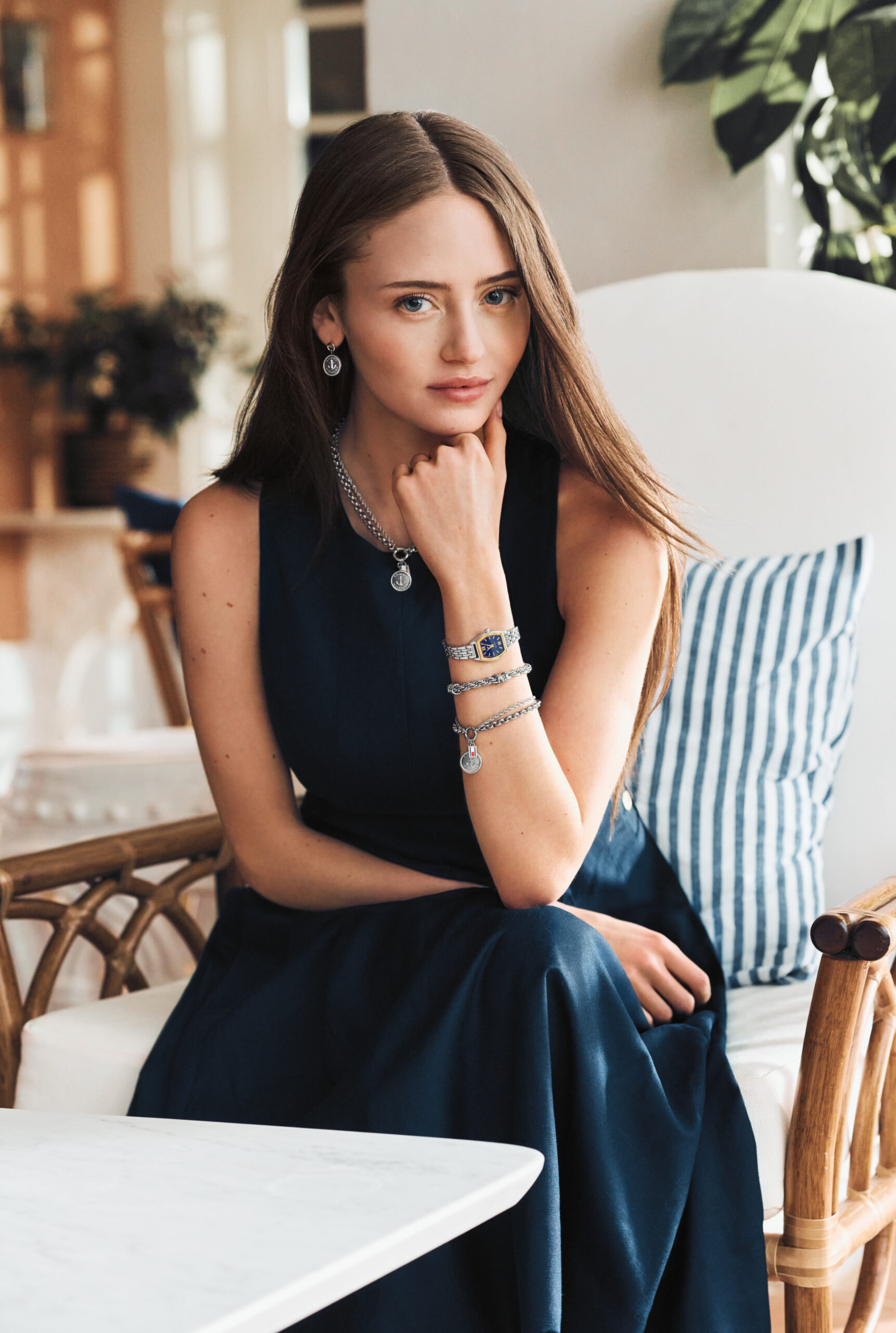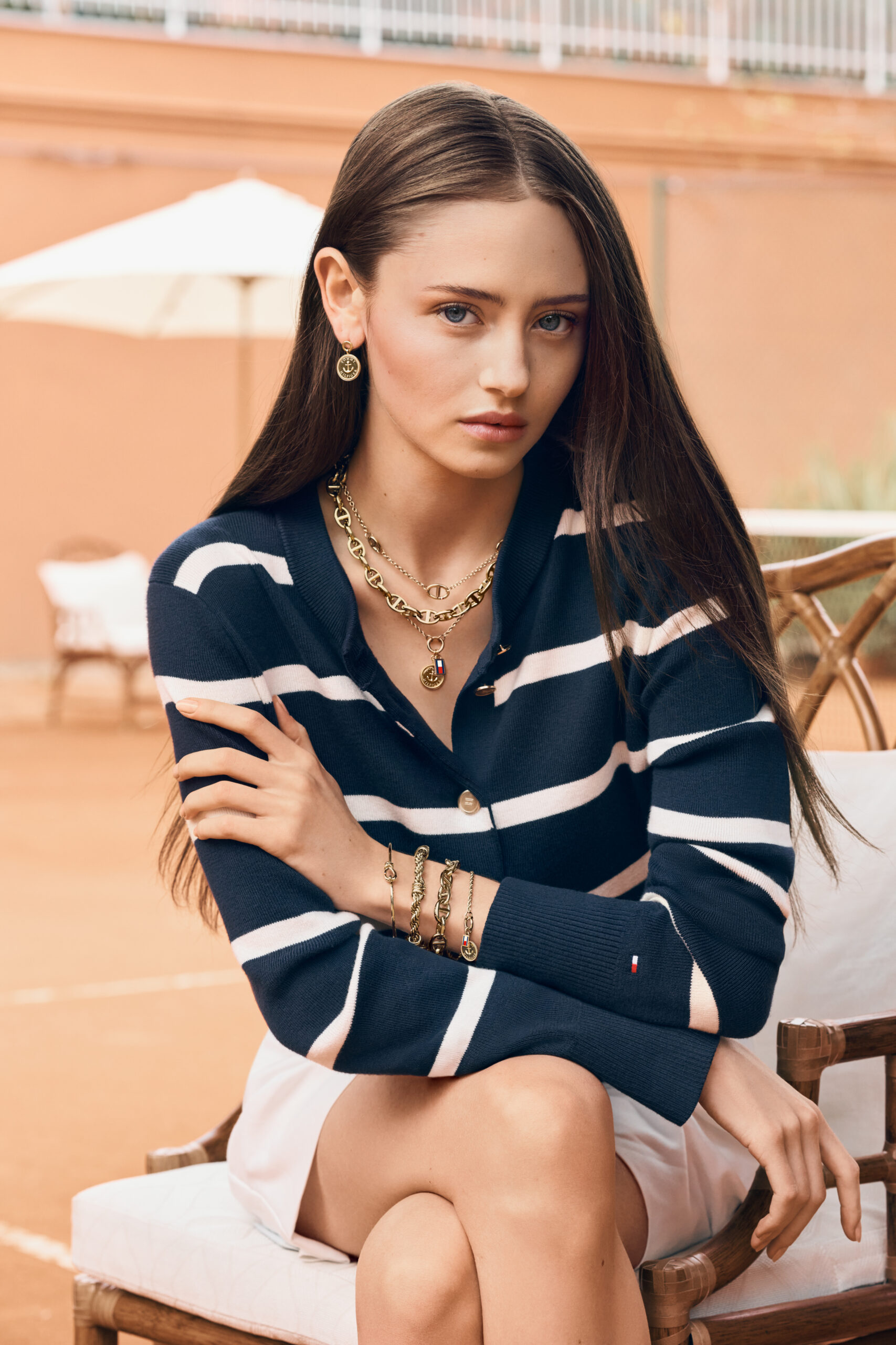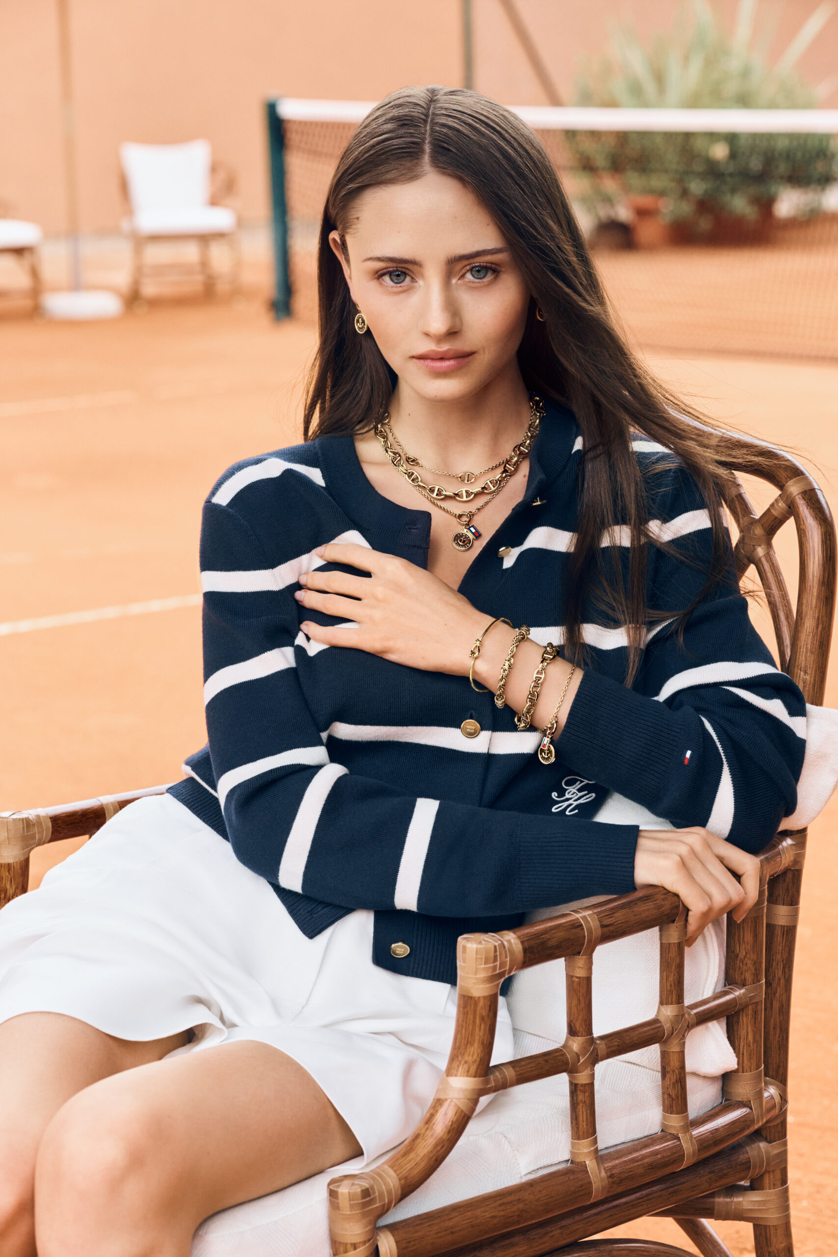 In der Kampagne kombiniert sie mehrere Schmuckstücke aus den Linien Marina und Nautical Charms zu einem vielschichtigen Ensemble, das maritime Codes neu interpretiert. Ankerdetails, gedrehte Seile und ikonische Flaggenmotive treffen auf goldplattierte Oberflächen – ein Spiel aus Symbolik und Sommergefühl, das sich in Halsketten, Armbändern und Ohrringen fortsetzt.