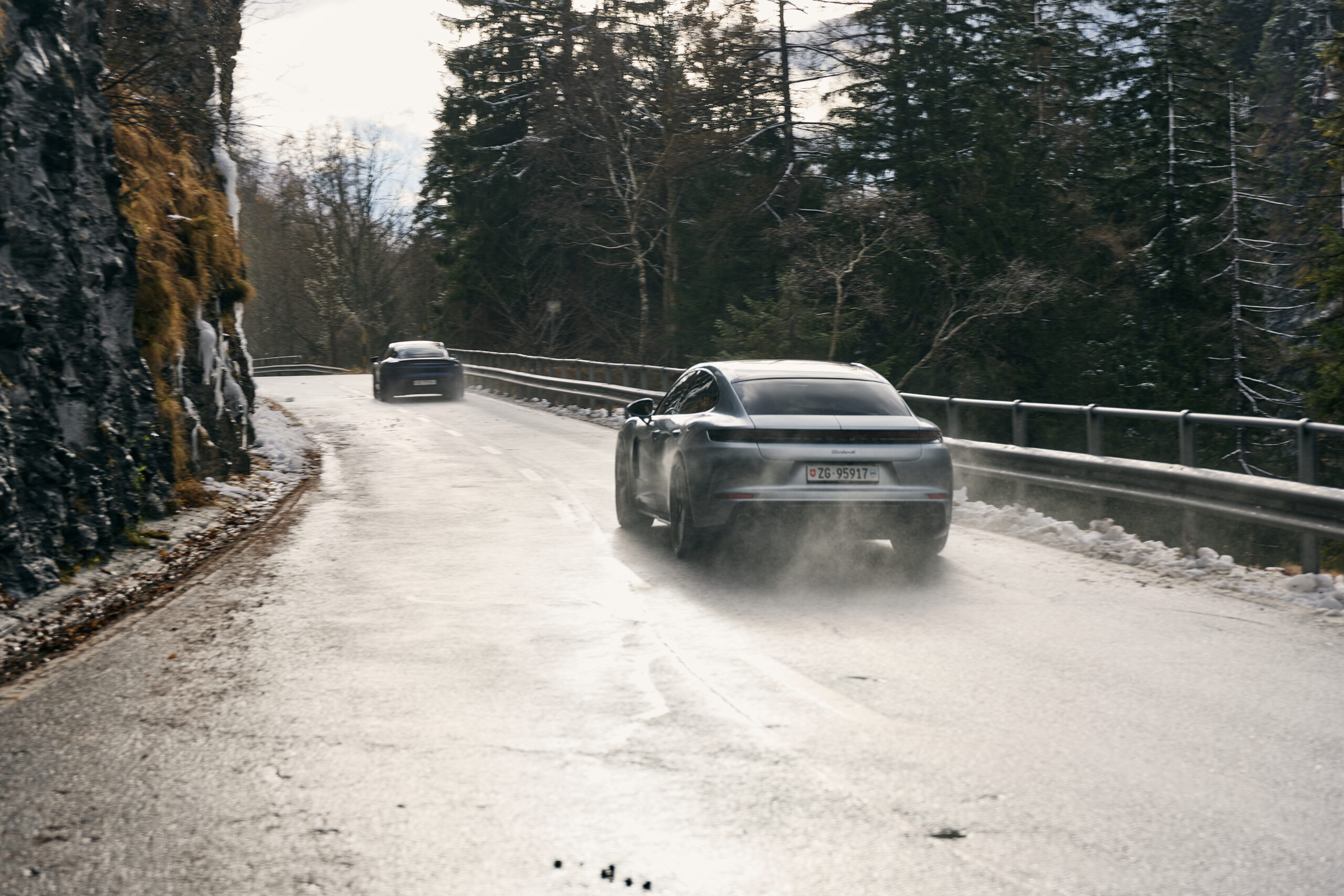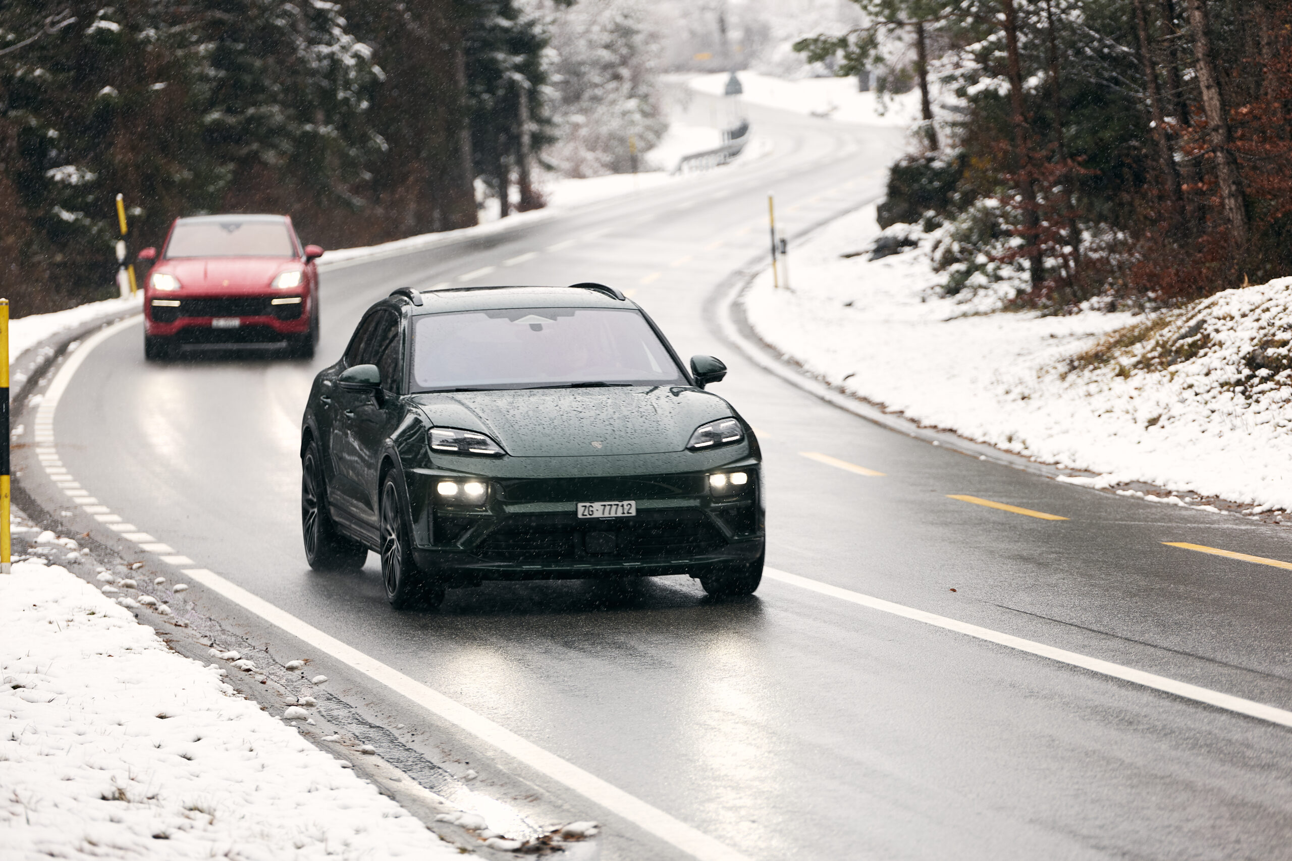 Auch der Taycan 4 S lieferte eine starke Performance ab. Mit seinem Allradantrieb und seiner tiefliegenden Batterie sorgte er auf gesamter Strecke für Stabilität und für gute Traktion – trotz Schneefall und eisigen Temperaturen.