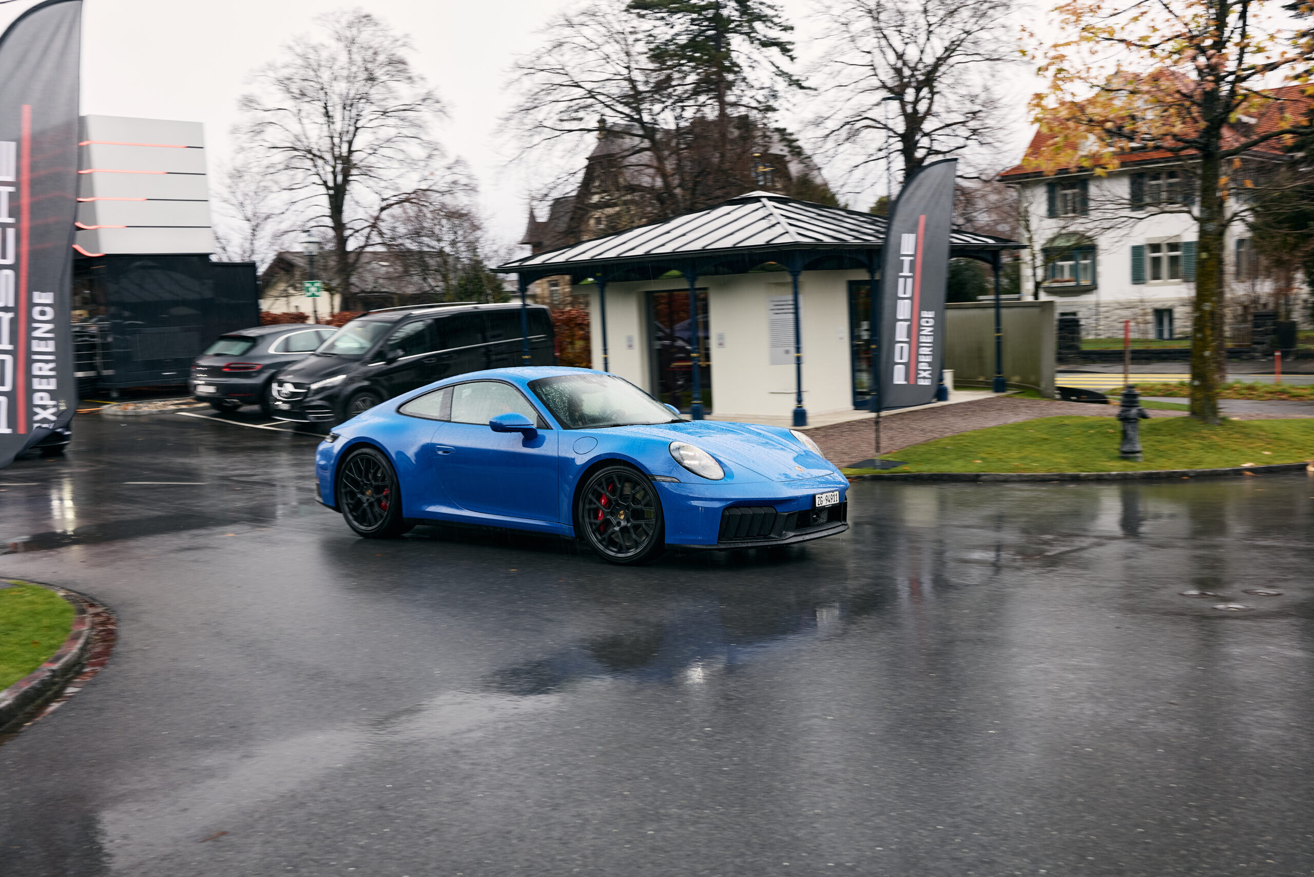 Der Treffpunkt hätte exklusiver kaum sein können: Das Porsche-Team empfing uns im festlich geschmückten Grand Resort Bad Ragaz mit einer ganzen Reihe verschiedener Porsche-Modelle. Insgesamt würden wir an diesem Tag sechs verschiedene Stops einlegen und sechs mal zwischen verschiedenen Porsche-Modellen wechseln.