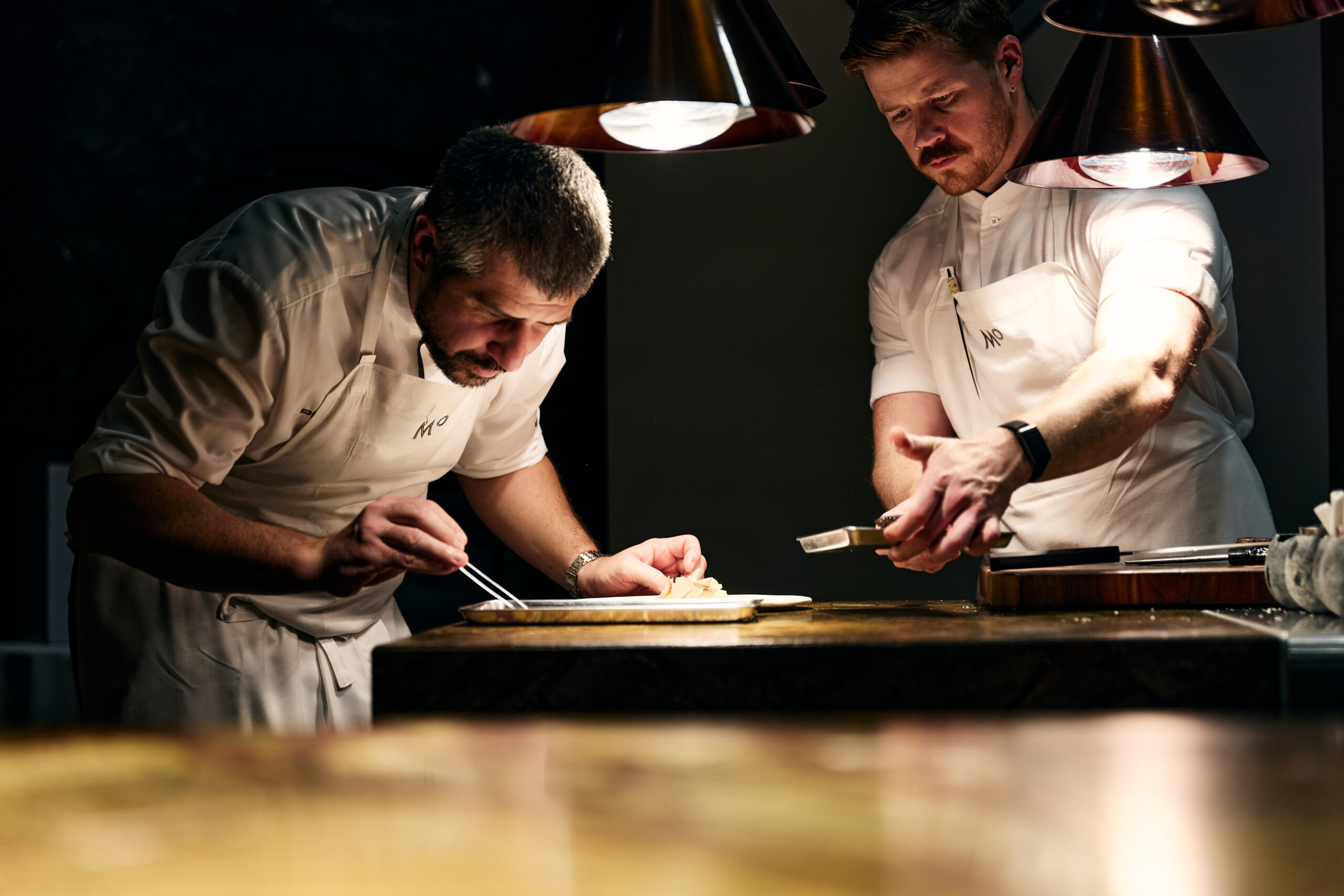 Zurück in Bad Ragaz wartete ein herzlicher Empfang in Sven Wassmers Sternerestaurant Memories auf uns. Dieser Ort strahlt schon beim Betreten eine besondere Wärme aus. Die Lichter sind gedämmt, Raumteiler aus organisch geformtem Holz geben dem Raum Struktur, ohne die Offenheit zu nehmen, und die Küche geht fliessend in den Gastraum über. Durch diese Gestaltung kann man den Köchinnen und Köchen bei ihrer Arbeit zusehen. Dies ist ein Detail, das Sven Wassmer beim Entwurf des Restaurants sehr wichtig war.