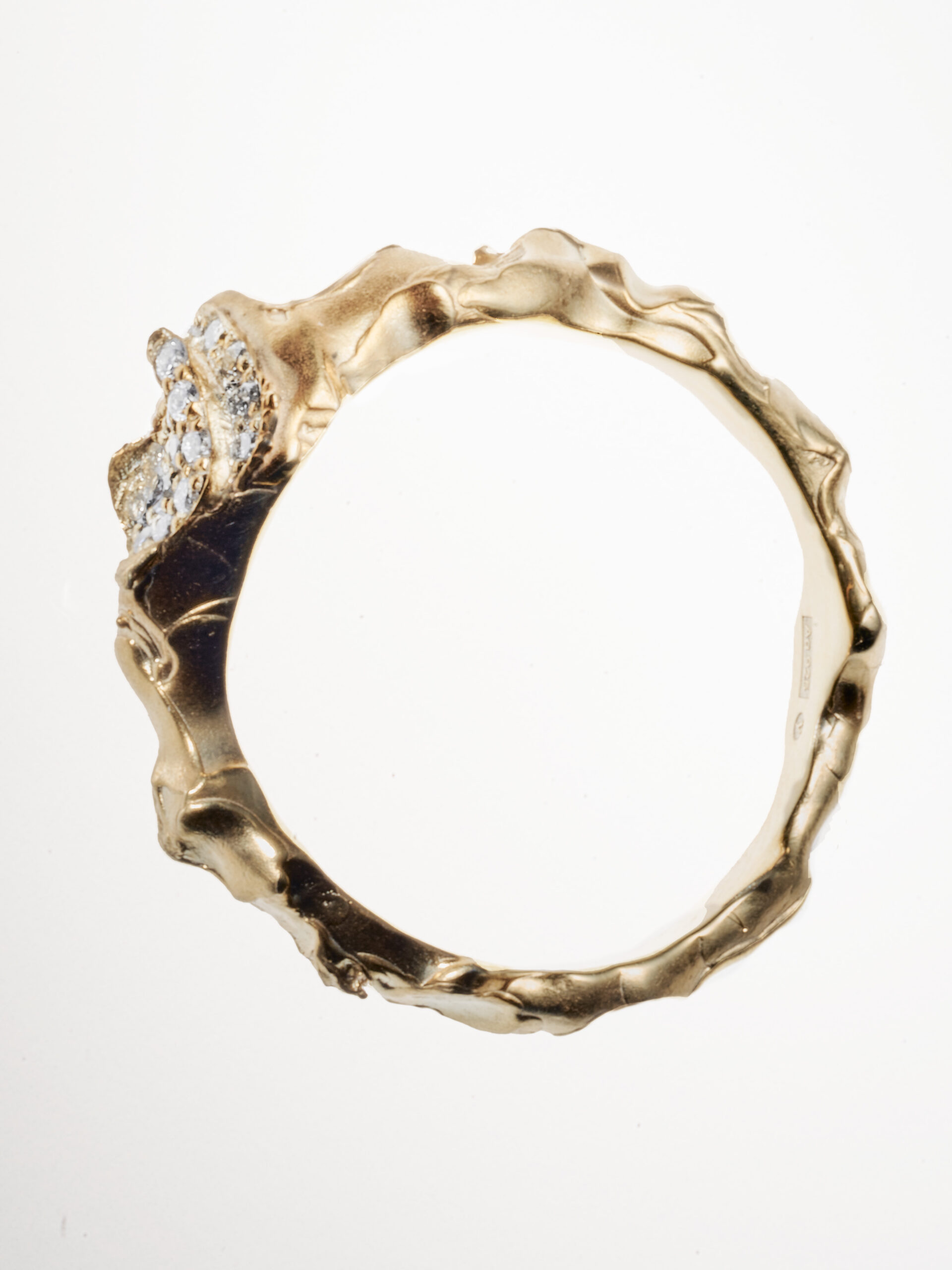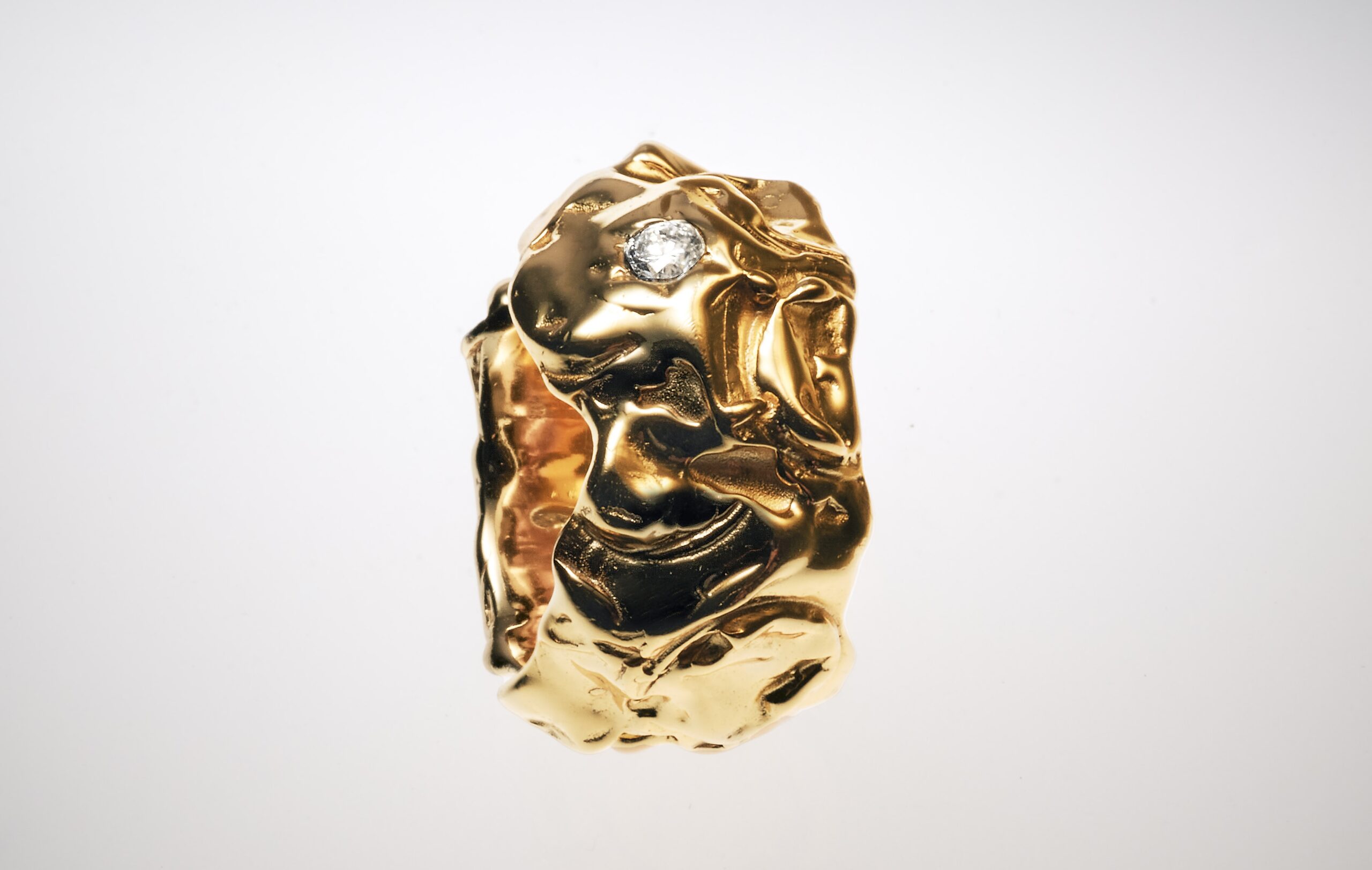 Im Zentrum steht ein Ring, der aus einer fortlaufenden Auseinandersetzung mit Oberfläche und Volumen hervorgegangen ist. Ausgangspunkt ist die Ästhetik des Weichen: aufgeblasene Formen, fragile Strukturen und Materialien, die eigentlich für Schutz und Kurzlebigkeit konzipiert sind. Durch gezielte Kompression und Transformation werden diese flüchtigen Zustände in massives Edelmetall überführt.