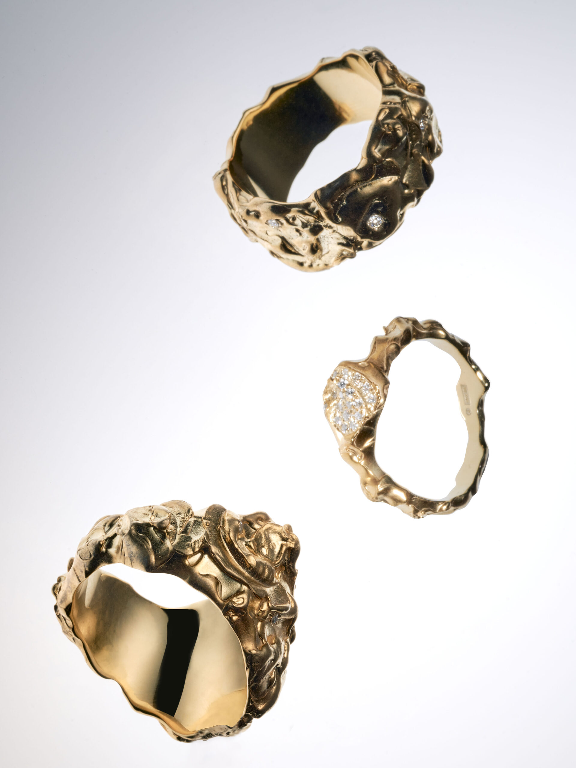 Jeder Ring wird auf Bestellung gefertigt und individuell geformt. Leichte Abweichungen in Oberfläche, Proportion und Textur sind dabei Teil des gestalterischen Prozesses. So entsteht ein eingefrorener Moment – eine Spur von Druck, festgehalten in Metall.